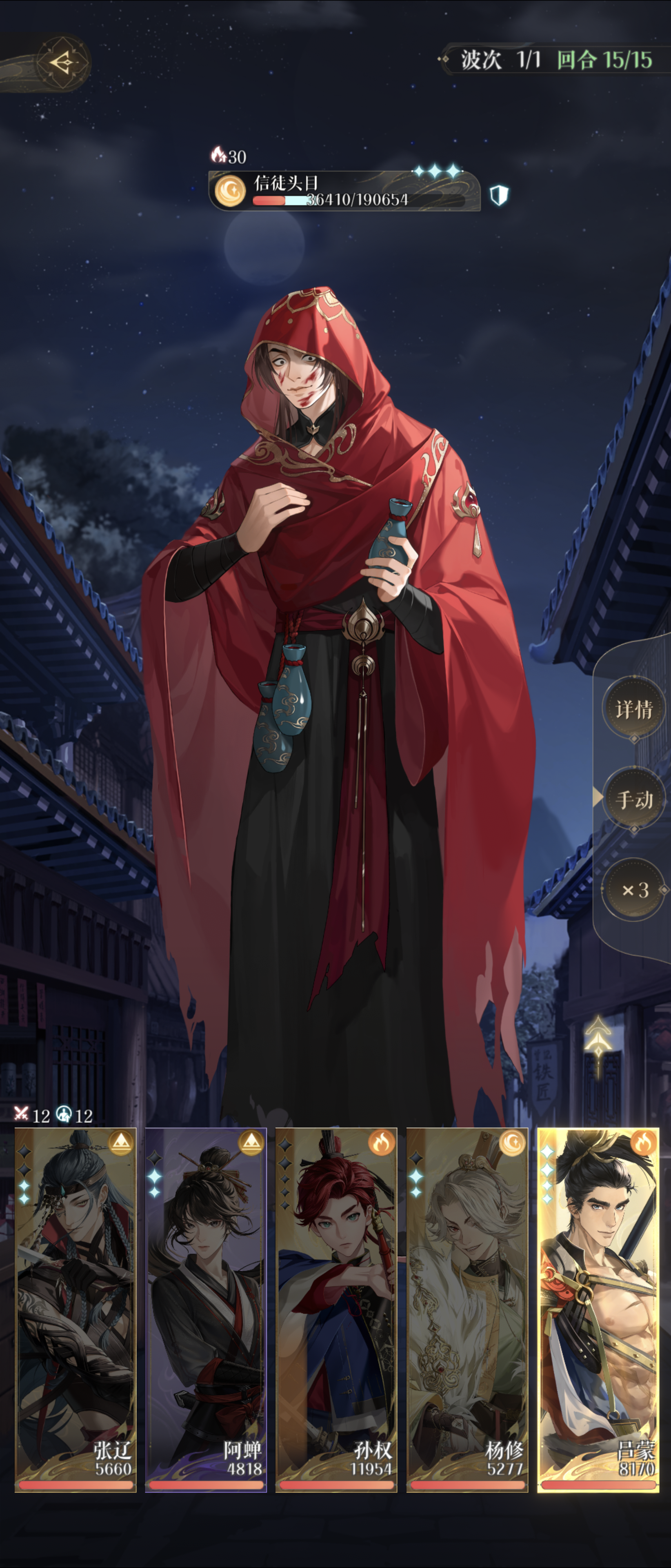 如图阵容是打的过去的,打完了没有地方截图了所以才上了张没打过的。重点在张辽要洗出命盘无路可退,赌张辽15连击。所以刚需张辽,剩下的输出随便带只要能在最后一回合把血线压到3.8w就行。注意张辽只有技能有斩杀效果,所以最后一波还要留一下张辽技能。