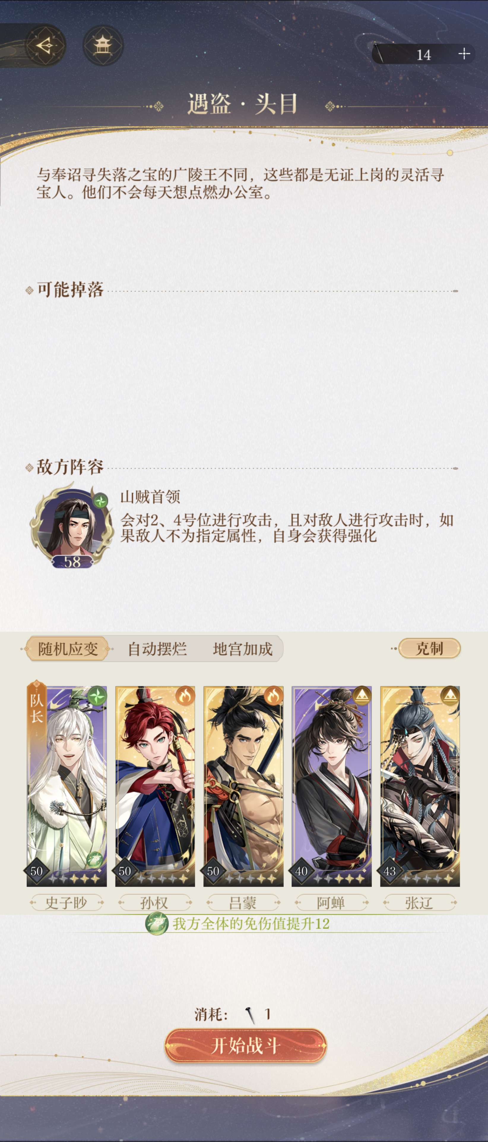 每打一次都录一下,本来以为寄了,没想到郭嘉的二星天赋居然有奇效。 打怪打出了大保底的体感。 如图所示,我没下任何限定池,常驻池除了王粲(一星)就是鲁肃(三星)郭嘉(二星),黑中之黑,没有大C就靠养阿蝉,杨修是活动给的,现在努力养杨修中。 1,队伍配置: 阿蝉当队长,因为有每3回合增攻。 王粲+史子眇因为王粲的回血太难等了。 杨修是任务给的用来赌伤害,事实上我赌出来的都是小点[表情_生气] 郭嘉是看