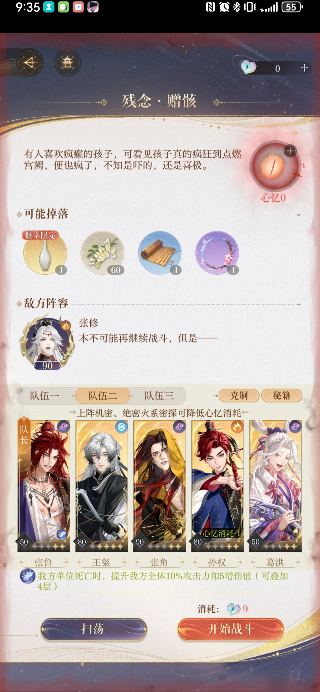 不知道为什么就过了,可能是死的人太多导致张修没免伤了 理论上其实王粲和孙权换谁都行,能多活几轮给角叔吸血,减轻张鲁压力就可以。 张角90+14,6300攻击,天宫+反噬 张鲁伐身+阴属性强化 葛洪狡兔+阴属性强化 王粲常规盾奶,孙权常规盾权 出了孙权全程防御,其他全自动,哪里亮了点哪里 噩梦的话大约输出就不够了