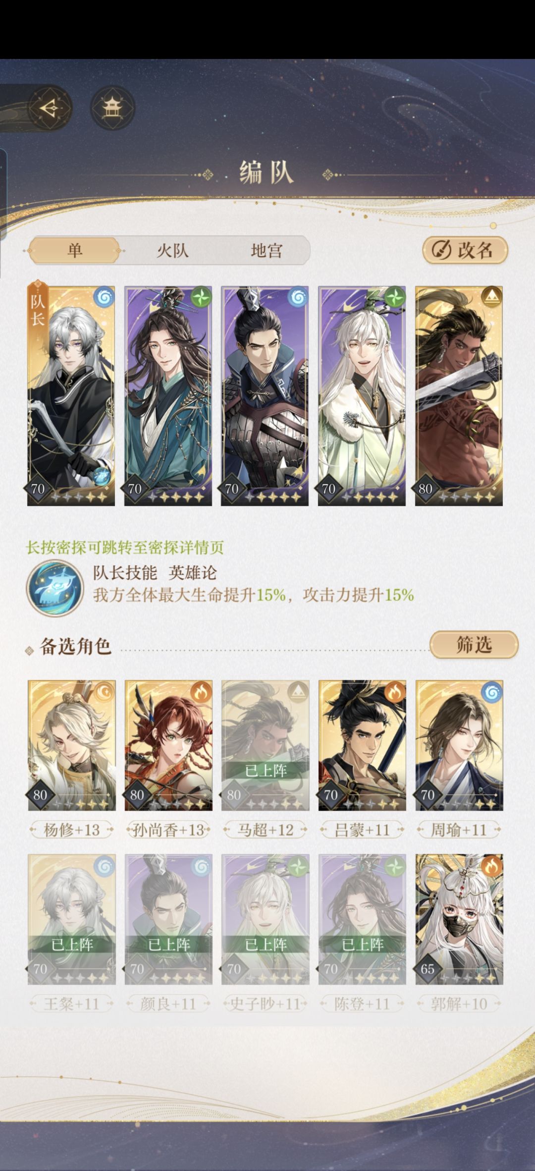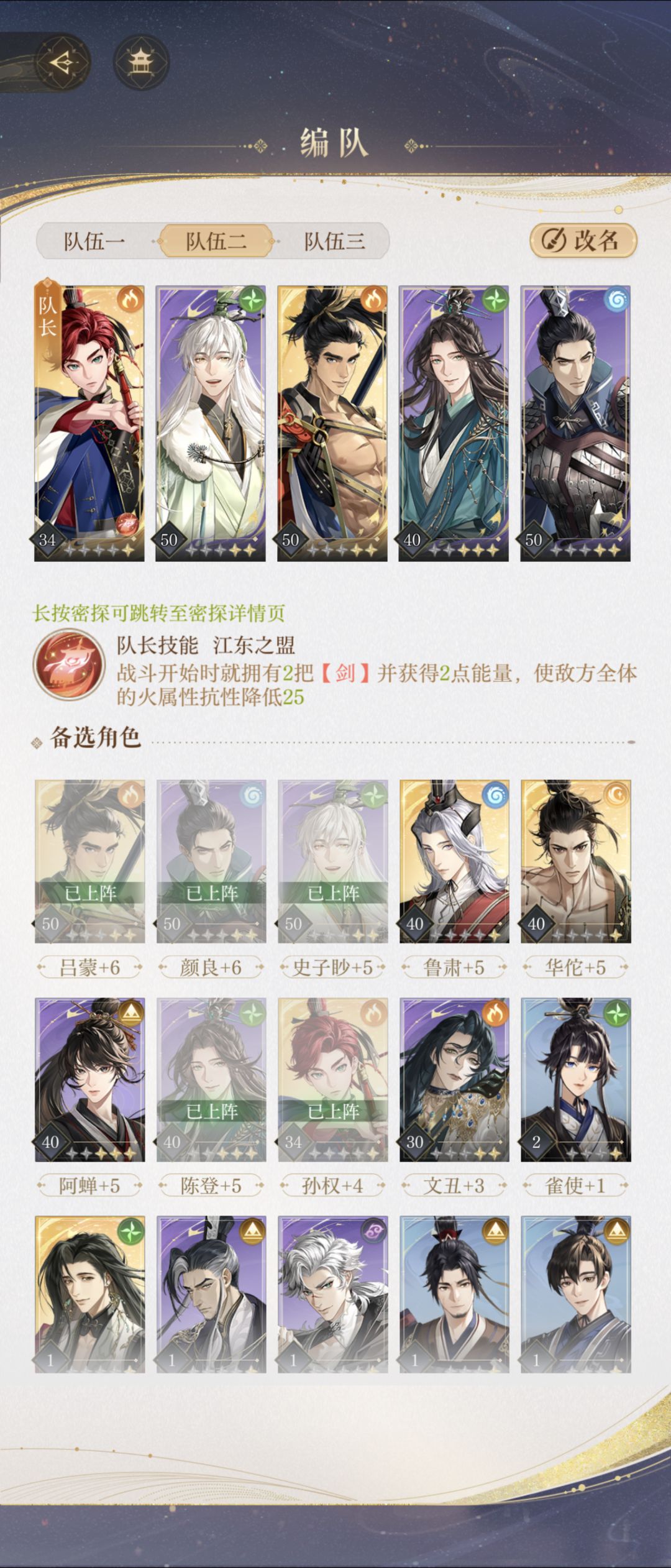 杨修+孙尚香+孙权+阿婵+陈登(50+7为主) 全员输出,不带奶盾,boss只会奶自己不会普攻你 无对策密探过关只有两点!高输出+运气!!! 这关我打了好多遍,一开始我的输出根本不够! 我做了什么事呢? ①把所有密探身上的星石拆下来了,按照密探输出优先级开始安输出石头,我的输出主力是香香,其次要靠杨修赌骰,再是阿婵稳定输出,给孙权装剩下的,轮到陈登就剩一星的太阴还有一个忘记了,可以参考一下我的星石