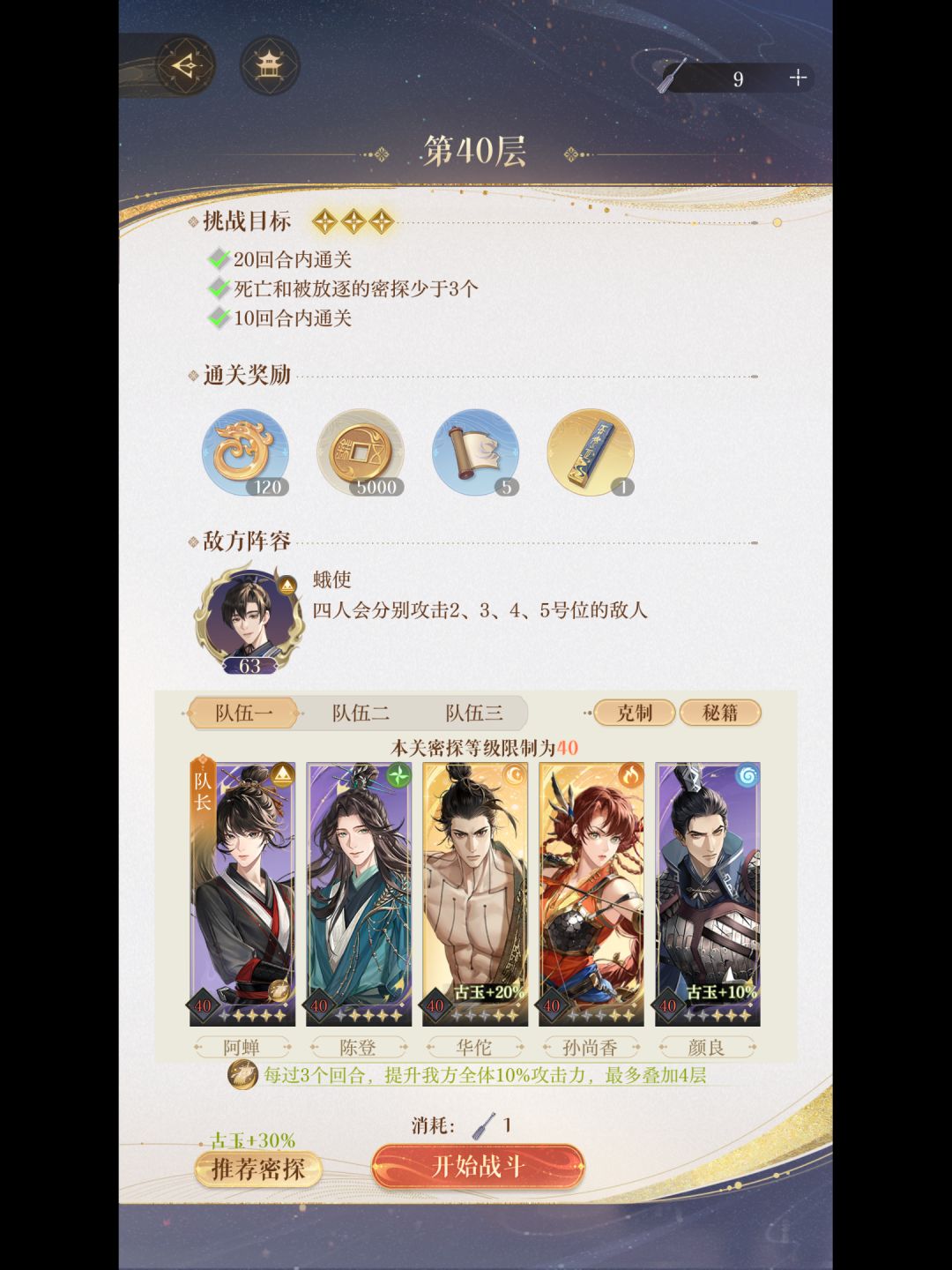 🌟机制&重点 蛾使雀使伤害比较高,优先打这两个,然后打蜂使。 因为boss会固定攻击2,3,4,5号位,所以要注意一下密探的站位。二号五号位放血量高的密探,三号位放奶妈,四号放输出最高的密探,队长上阿蝉。 🌟具体步骤 回合1 全员普攻 回合2 登大,香蝉大,其余普攻 回合3 颜良华佗大,其余普攻 回合4 全体普攻 回合5 颜普,蝉登香大 回合6 颜大,其余普攻,结束 纯经验分享,打法多样,仅供参考