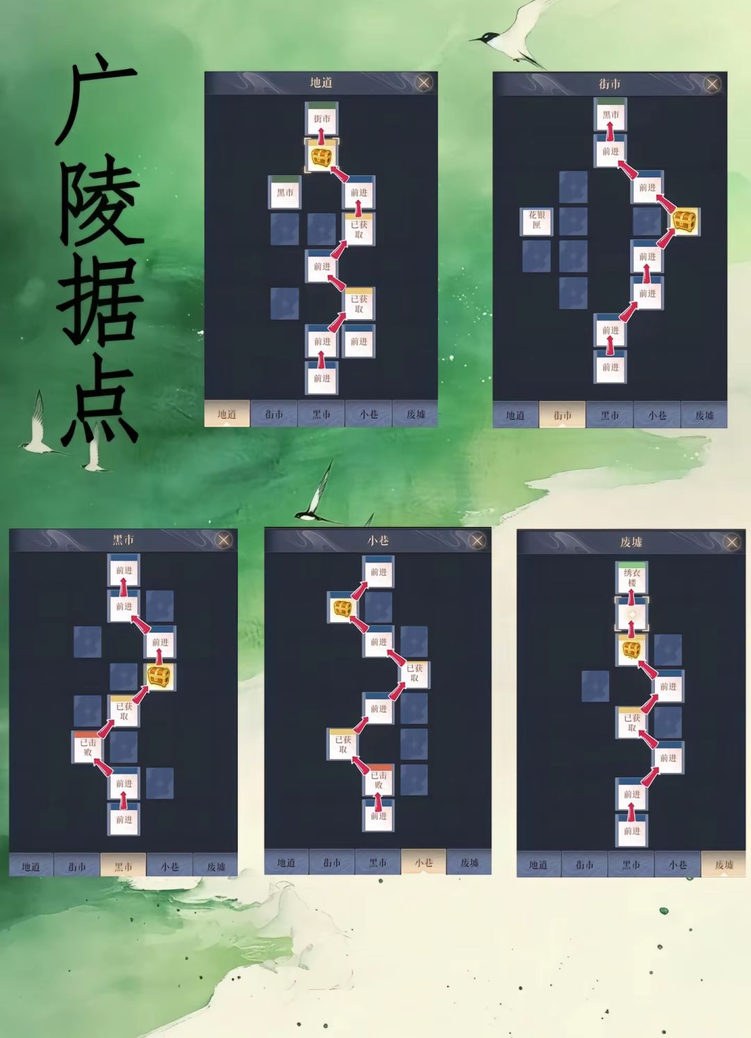 据点等级会影响出材料的概率,如果要直接刷据点的话最好在4、7级刷,4是2星据点,7是3星据点,三星据点每次刷必出材料。 广陵:新手偶尔刷一些鸢羽。派遣可以刷得建筑材料,建筑材料前期记得多攒,后期据点解锁升级可以快一些,提高刷材料效率。 雒阳:每天第一件事--派遣密探,雒阳据点派遣密探可以获得(鸢食),增加每日任务次数,还可以出白金币,白金币又可以换成体力,运气好一次可以获得3、4个茱萸就是一抽了。
