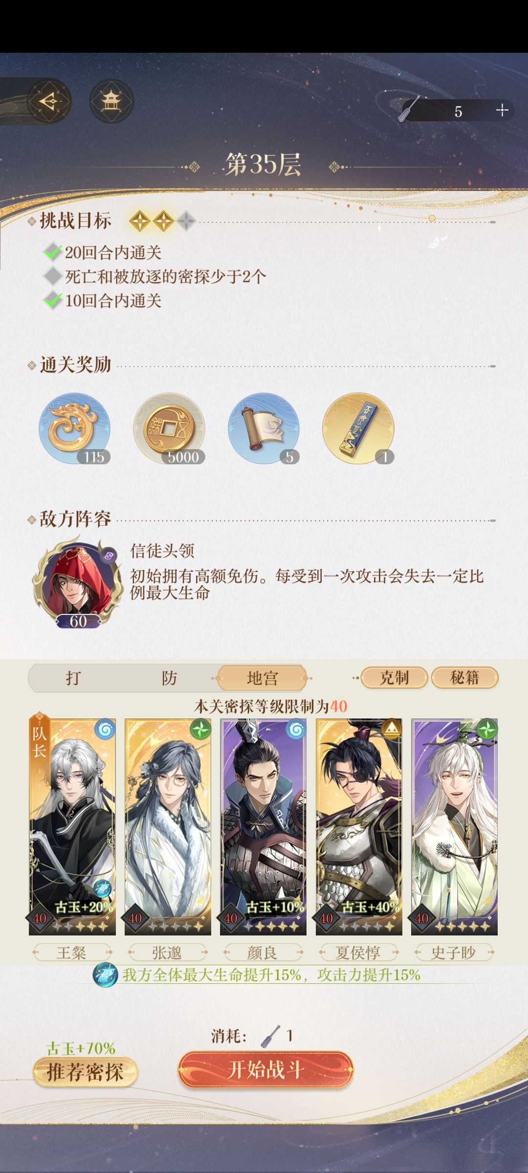 先上结论。 以我的目测和上手实操的估计。 地宫想要全三星的话。 你需要养的人物有∶ 郭姐王粲颜良孙尚香孙权陆逊吕蒙|郭嘉/贾诩。 ———————— 打完国服地宫忽然觉得,蒸鹅心...... 我曾经以为国服地宫的boss不是上难度了,是因为这些密探卡抬了,所以boss的四维也就自然而然增加了。 但是当我打到55关的时候,发现水桶的血也加了,那我希望等灵犀互娱把水桶密探放上来的时候也给我抬一下强度。 —