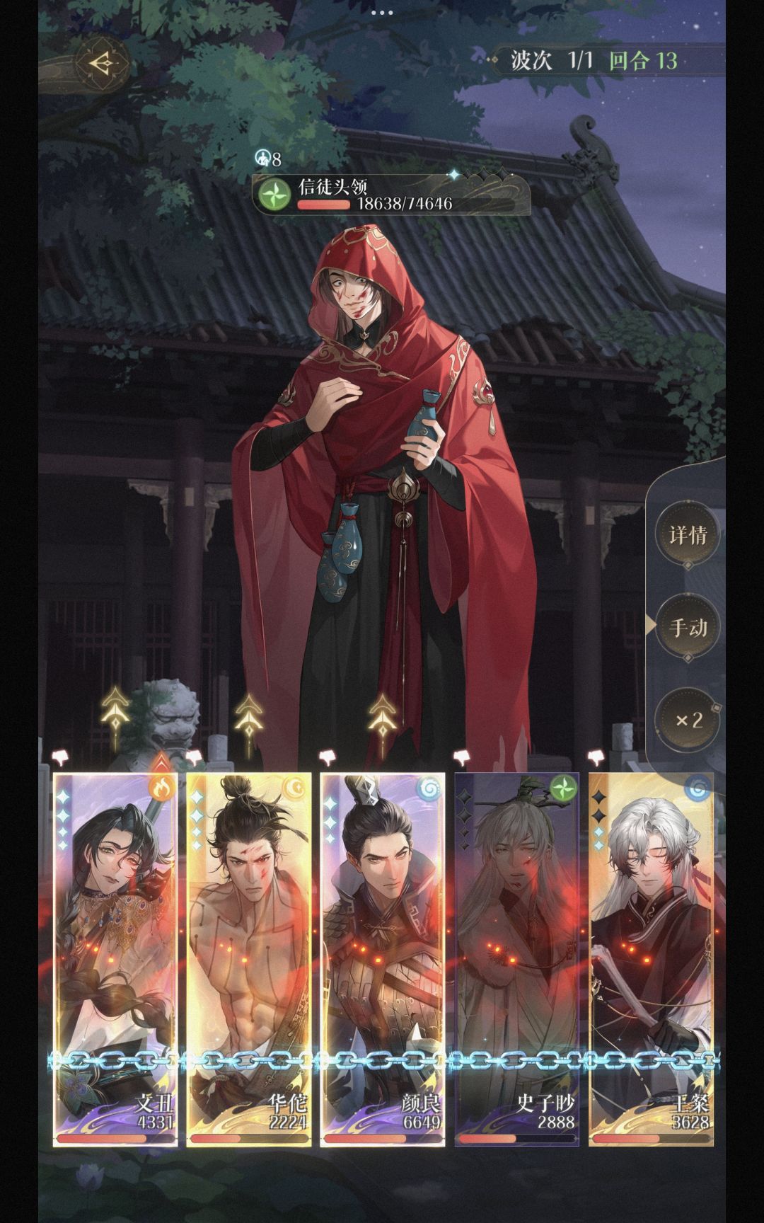 四保一,文丑主c,王璨能量命盘。 开局利用华佗和文丑队长,两回合把小兵清掉。(因为我伤害不够,BOSS加了8层攻击,巨疼) 史子眇平时不用回血的话可以防御。 2回合王璨开大,大家平分伤害。 颜良大招好了不急着用,等王璨链子掉了再用。 四回合BOSS开大除颜良外集体防御。 以上,循环。 本人不是大佬,仅是本人过关办法,如果有更好的方法也不要骂我谢谢#如鸢