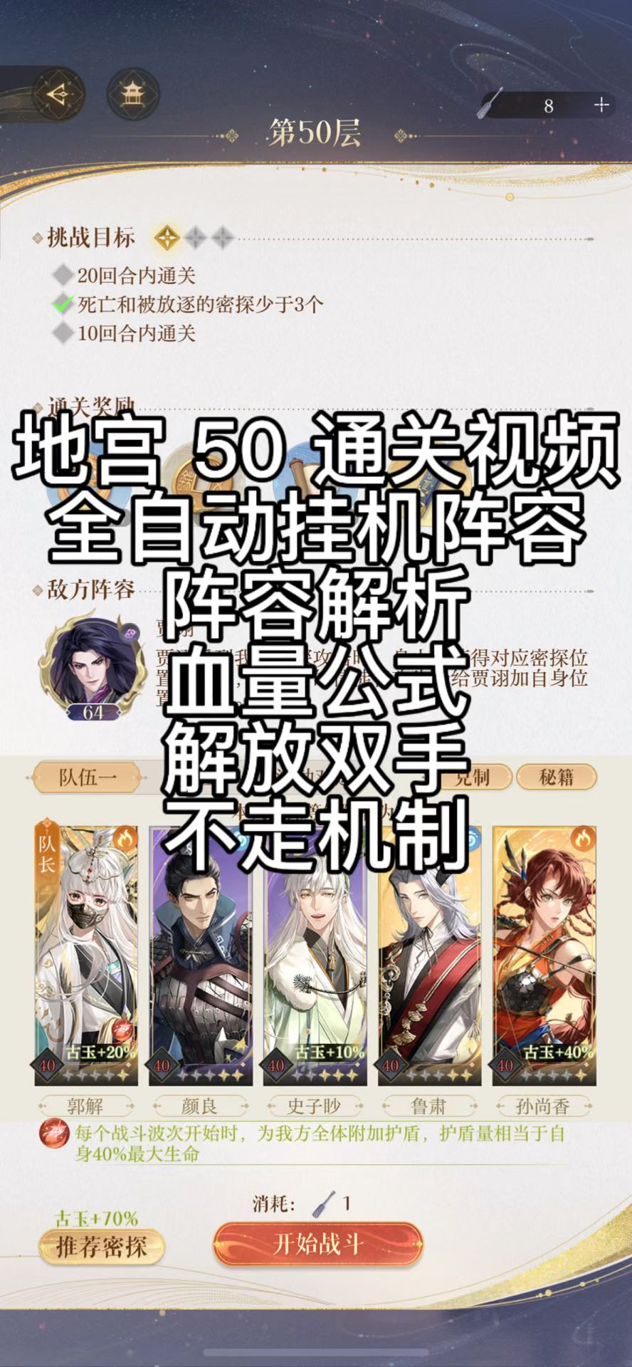 视频是第二遍 第一遍没带诡秘带了两个输出 打完贾诩看着一堆密探大眼瞪小眼[表情_微笑] 主要就是靠郭姐和颜良平A给盾 直接放弃技能 boss打人不是很疼 大招时候输出和狮子防御就行 我没有郭嘉只能上鲁肃 整体练度都不高 郭姐狮吕蒙50+6 颜良40+5 鲁肃只有38+2 如果是50回合上限的话 最少要留出几回合给诡秘清密探