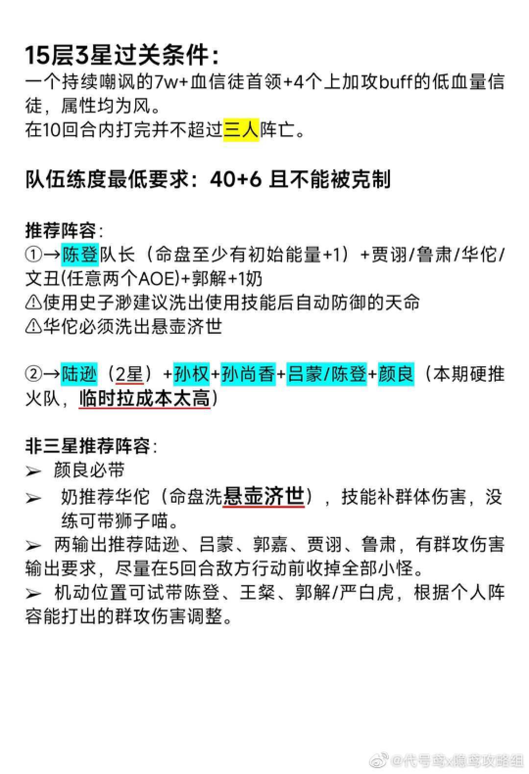 小鸢带来了15层三星阵容推荐以及非三星阵容推荐,需要什么洗命盘和队伍最低练度要求,殿下看详情图哦~(p1推荐阵容,p2打法思路) 希望能帮助各位殿下立马通关15层! 目前组内人都是第一次做攻略,如果殿下觉得我们有可以做的更好的地方,或者需要注意的地方,欢迎向我们提出。 转自:@代号鸢x隐鸢攻略组#攻略#游戏安利#游戏推荐#游戏讨论#游戏资讯