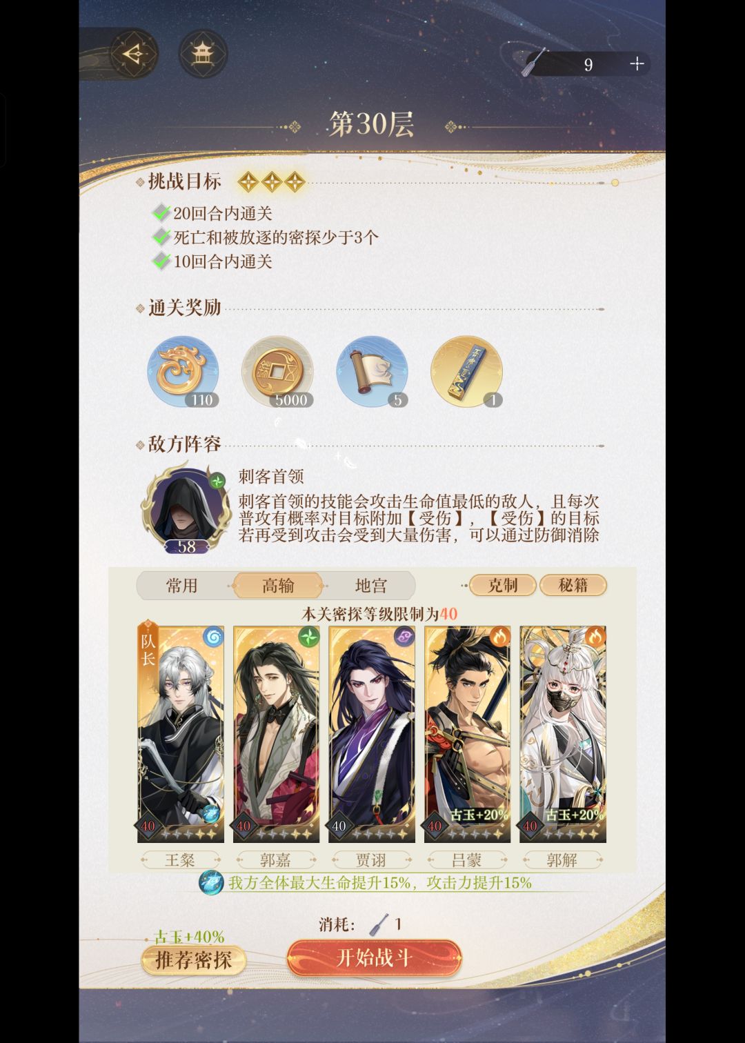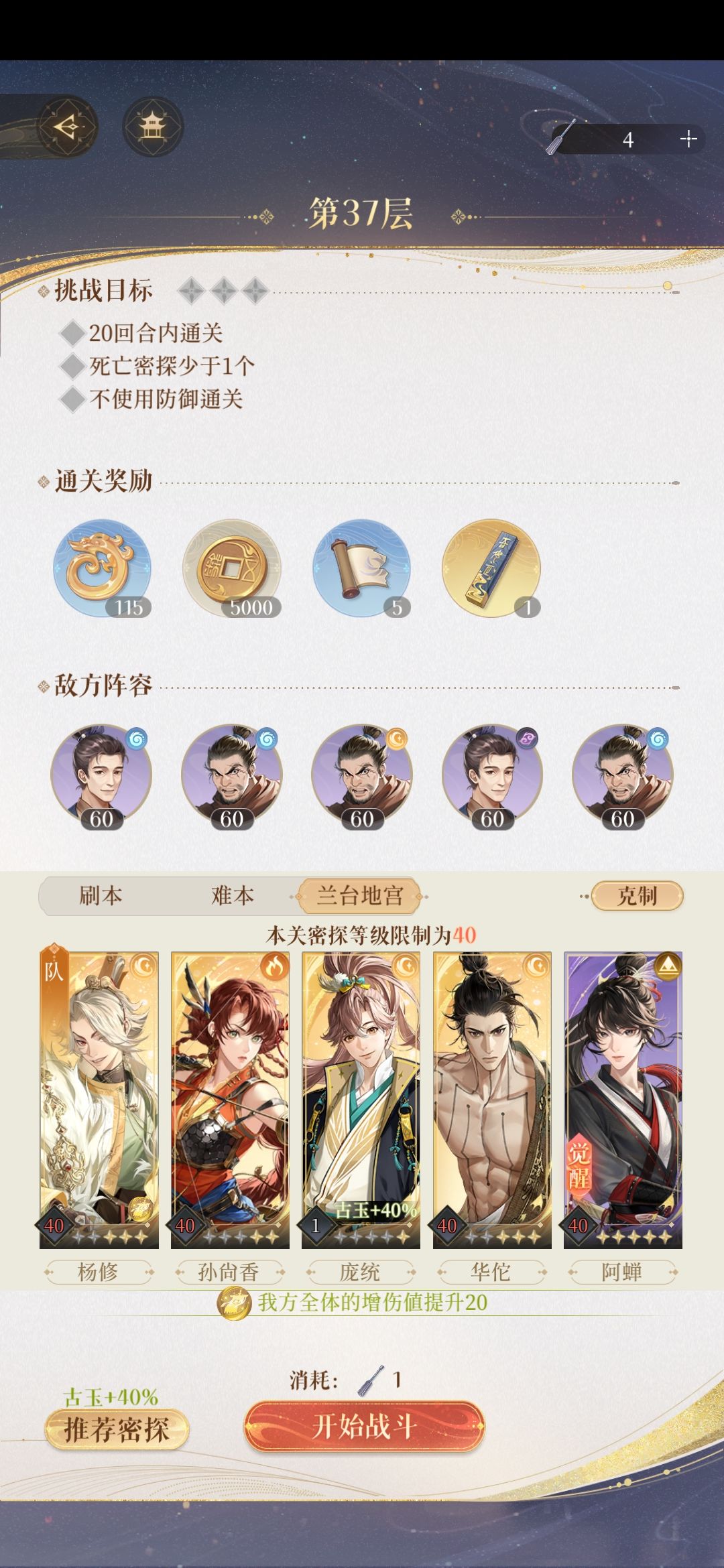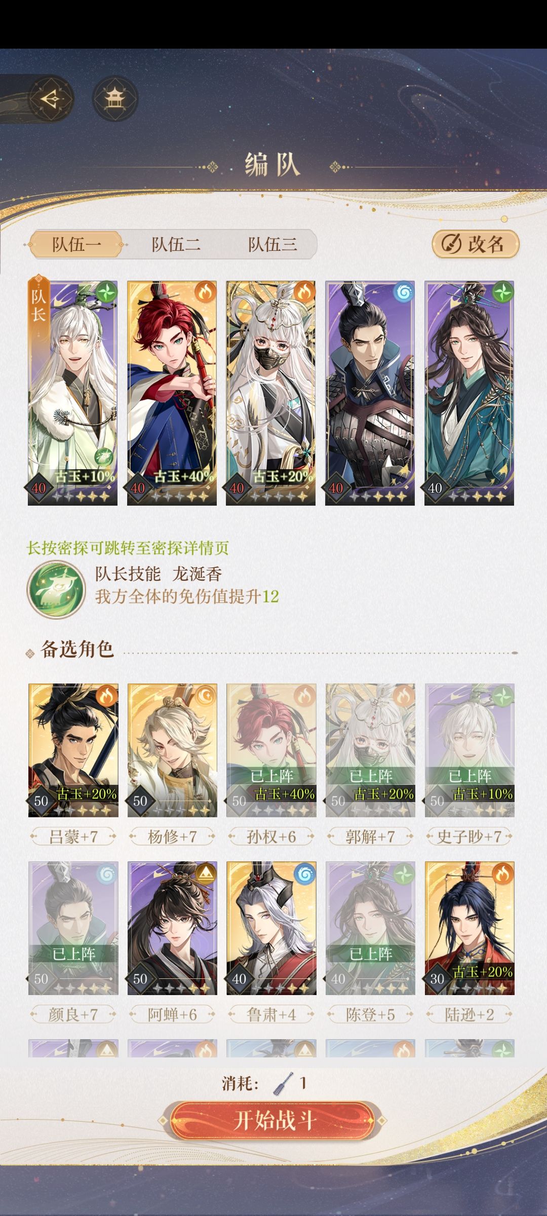 慢悠悠地打完了,比上期地宫好打多了。 摸清机制,练度足够,不用赌(上期地宫就是机制要赌),一小时可以通地下遗迹(上期一关都不止一小时) p1:地宫60三星配队,很明显是用爆发型配队会过的很容易的关卡 p23456:地下遗迹 看得出来,荀彧已经进入各大配队中了,人权卡没得说。