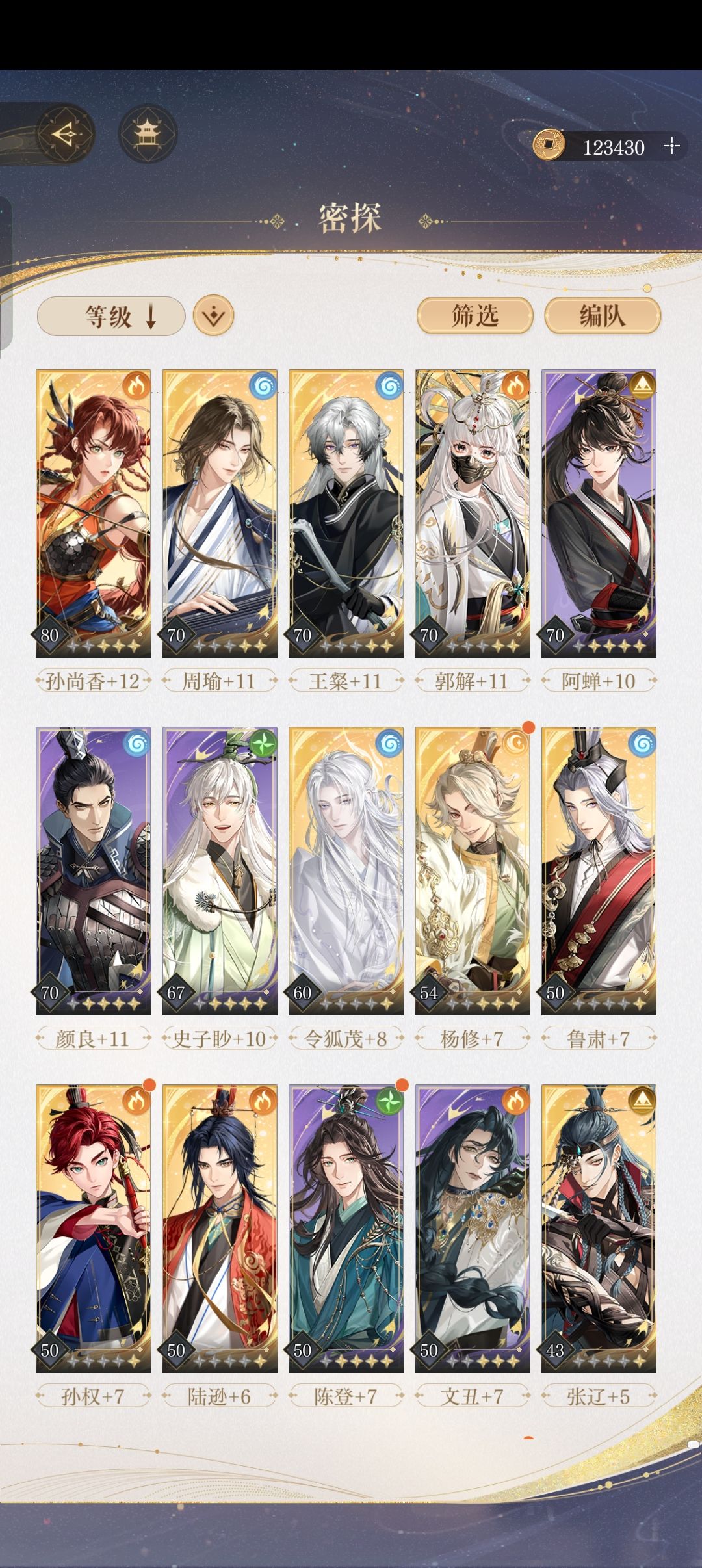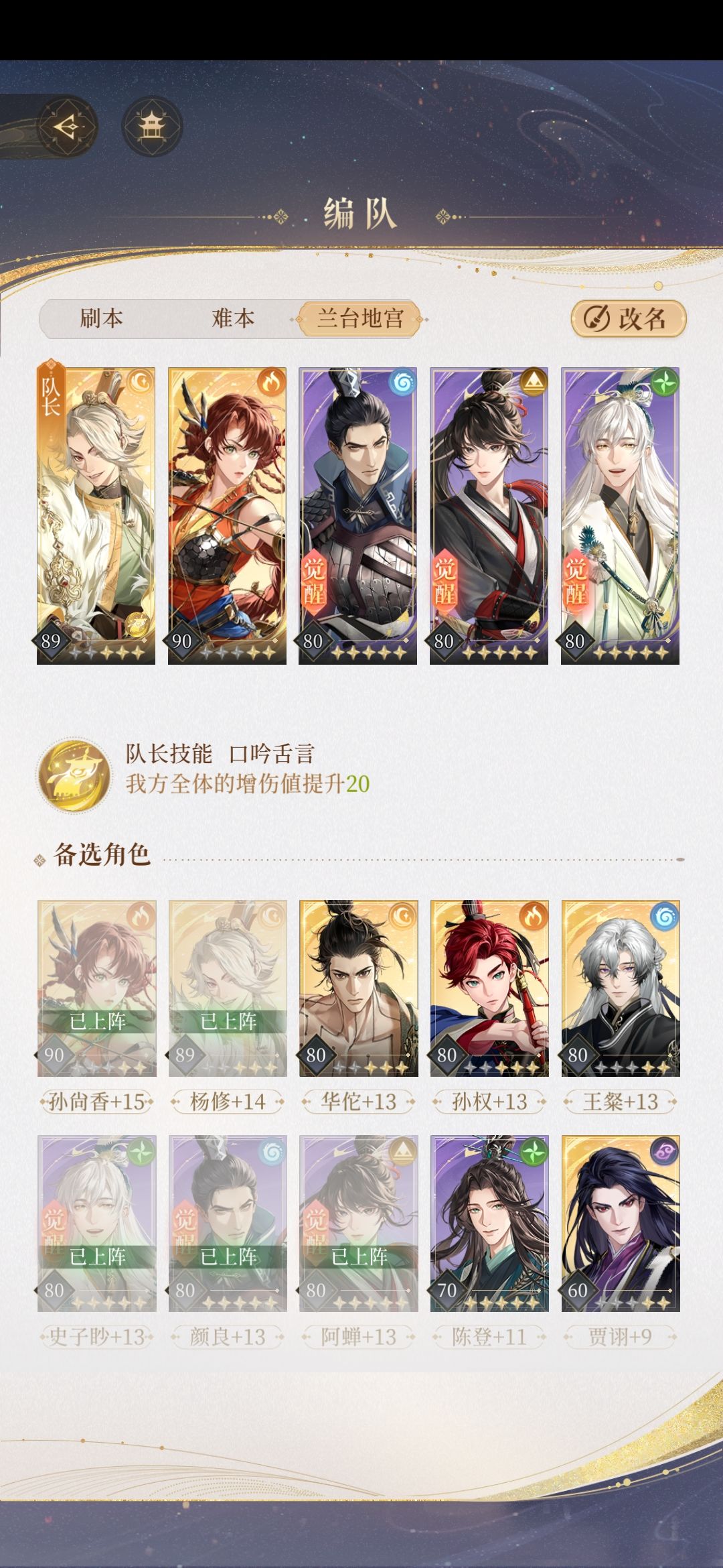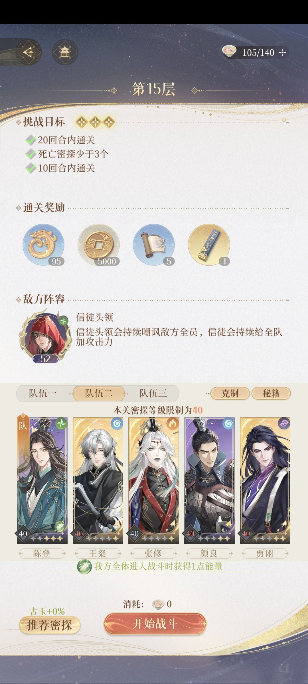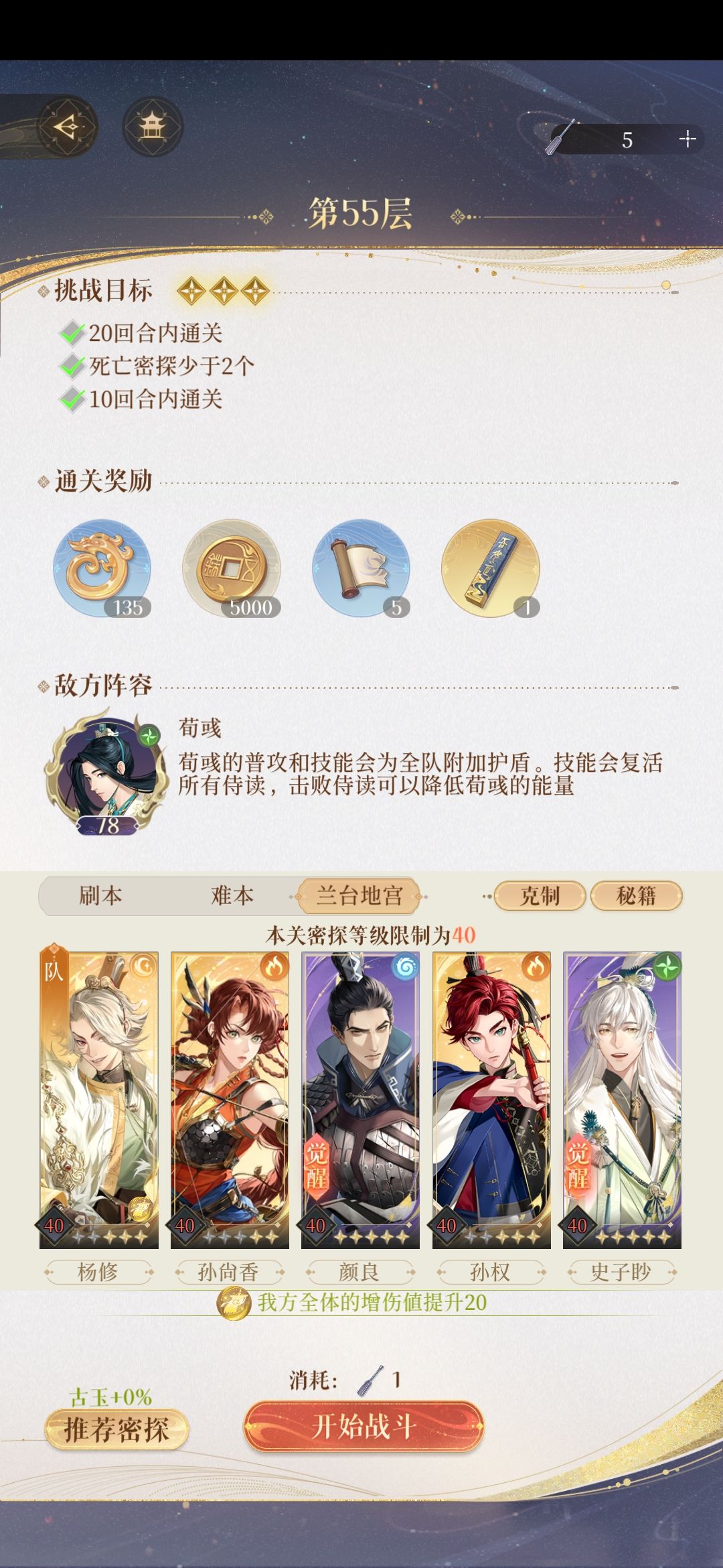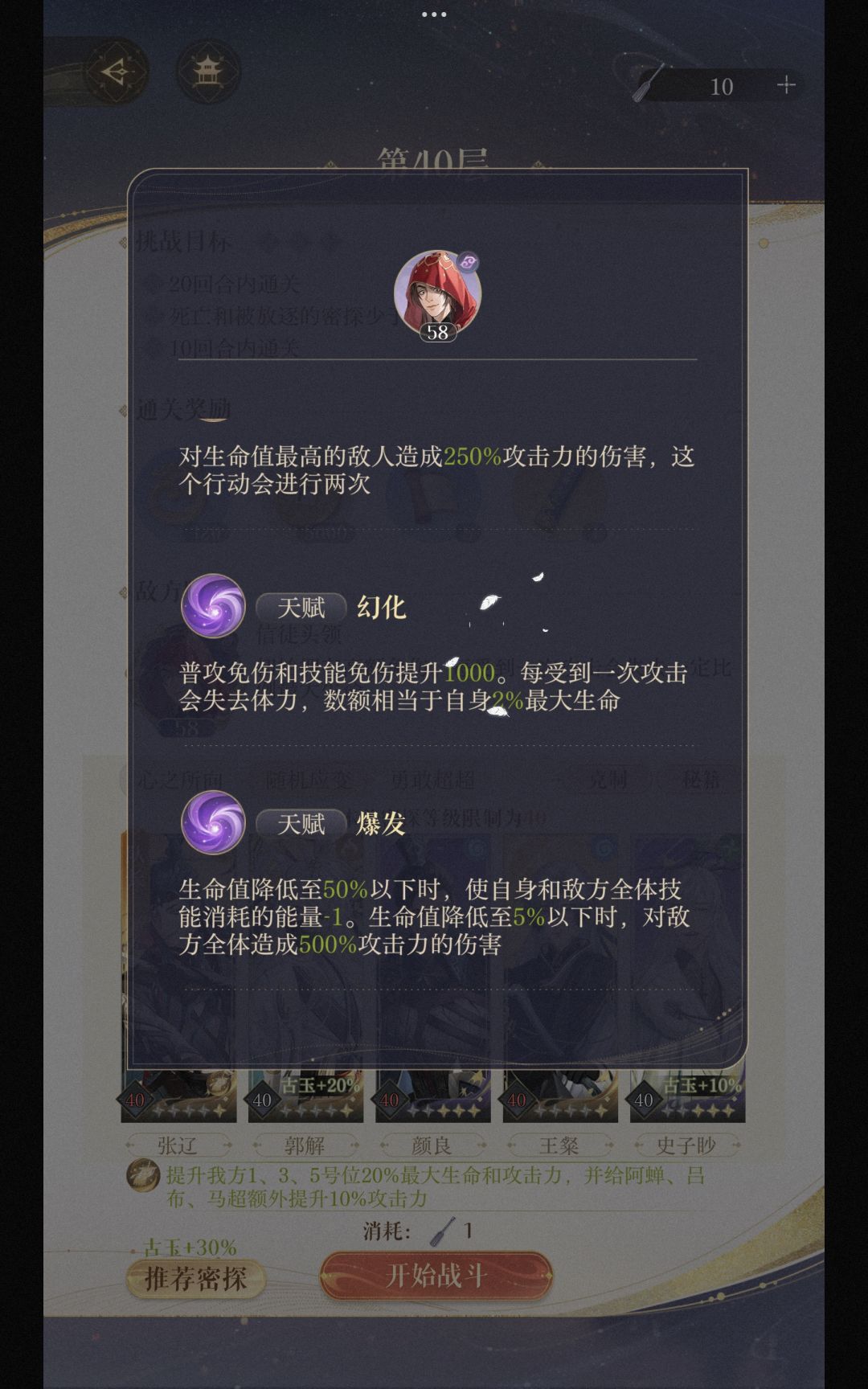 给还没过的分享一下 王粲【技能消耗-1】+华佗【悬壶济世,这个这相当于奶了】+文丑【初始能量+1】+颜良【这个没啥特别的】+鲁肃【没啥特别的,普攻大幅增加应该后期就不用开大了】 全都是50+7王粲是二星偶尔得的,终于过了,我觉得其实一星应该可以,就是尽力伤害能最大就最大,我是第三回合才干掉小怪的,应该没事有华佗普通加奶