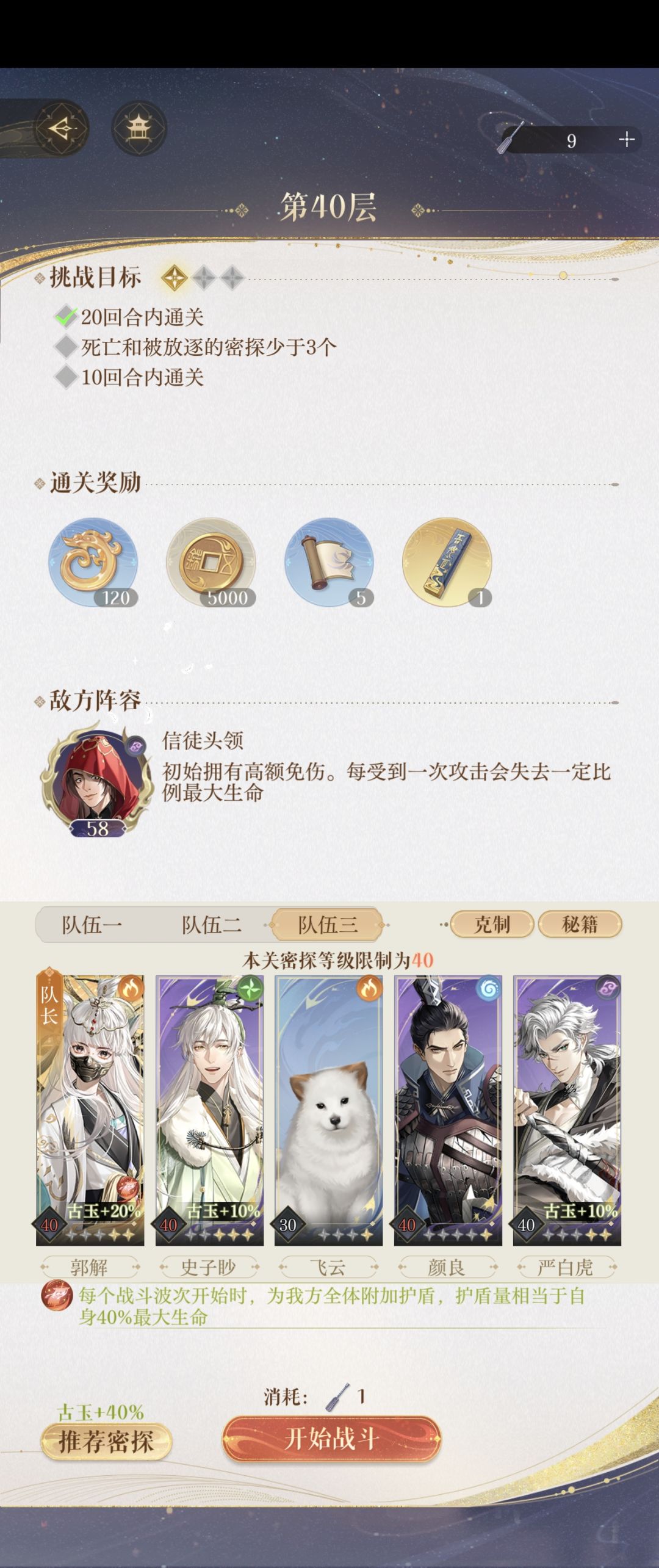 啥都没有的这一层卡死我了,2星颜良都没有,如果有2星颜良,郭姐的练度低一点也没事 该阵容需要赌,但是比较无脑,重点在于BOSS开大我们也也全体开大稍微控BOSS血正常打就行,但是要赌郭姐在最后爆炸或者爆炸后受击环节能反击,所以有反击概率提升命盘的会更好过 郭姐(60➕8):练度如上,有2星颜良的化郭姐的练度和命盘可以不那么苛刻,有普攻回盾和变阵最好 史子眇(50➕7):练度越高越好,命盘要有开大减