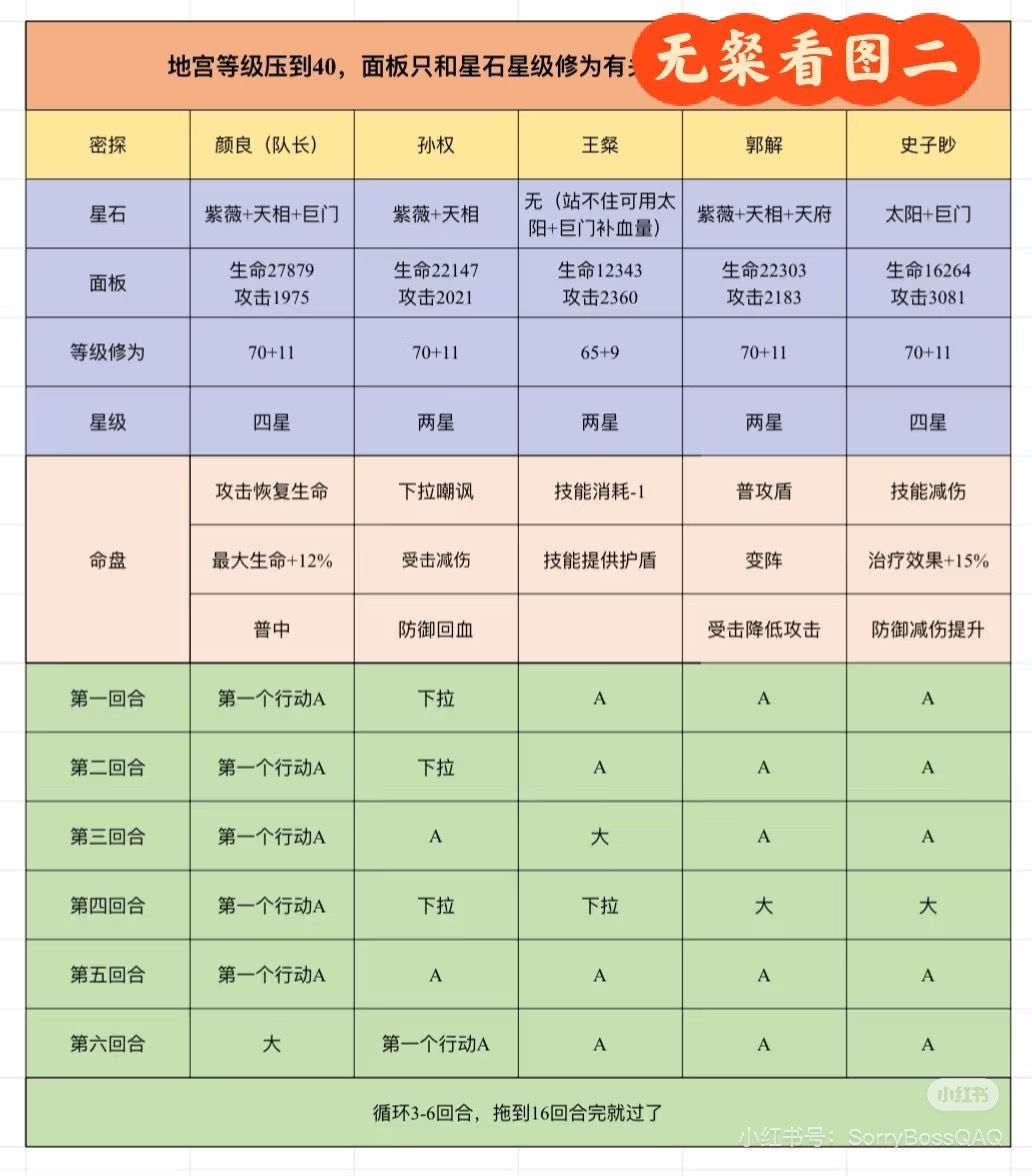 【机制】 boss每回合会反击第一个打她的人,每次普攻会降boss百分之二攻击(最高叠15次=30%攻击),每放一次技能刷新15层还会加技能增伤(越打越痛),打完第十六回合boss会退场。 【思路】 ①不上输出硬拖过十六回合; ②颜良队长,增加全体火抗; ③每回合尽量A满15次。 【阵容】 具体命盘星石操作步骤看图,简单来讲就是三个盾三选二。 ①颜良+郭解+粲+孙权+史子眇(图二)#如鸢