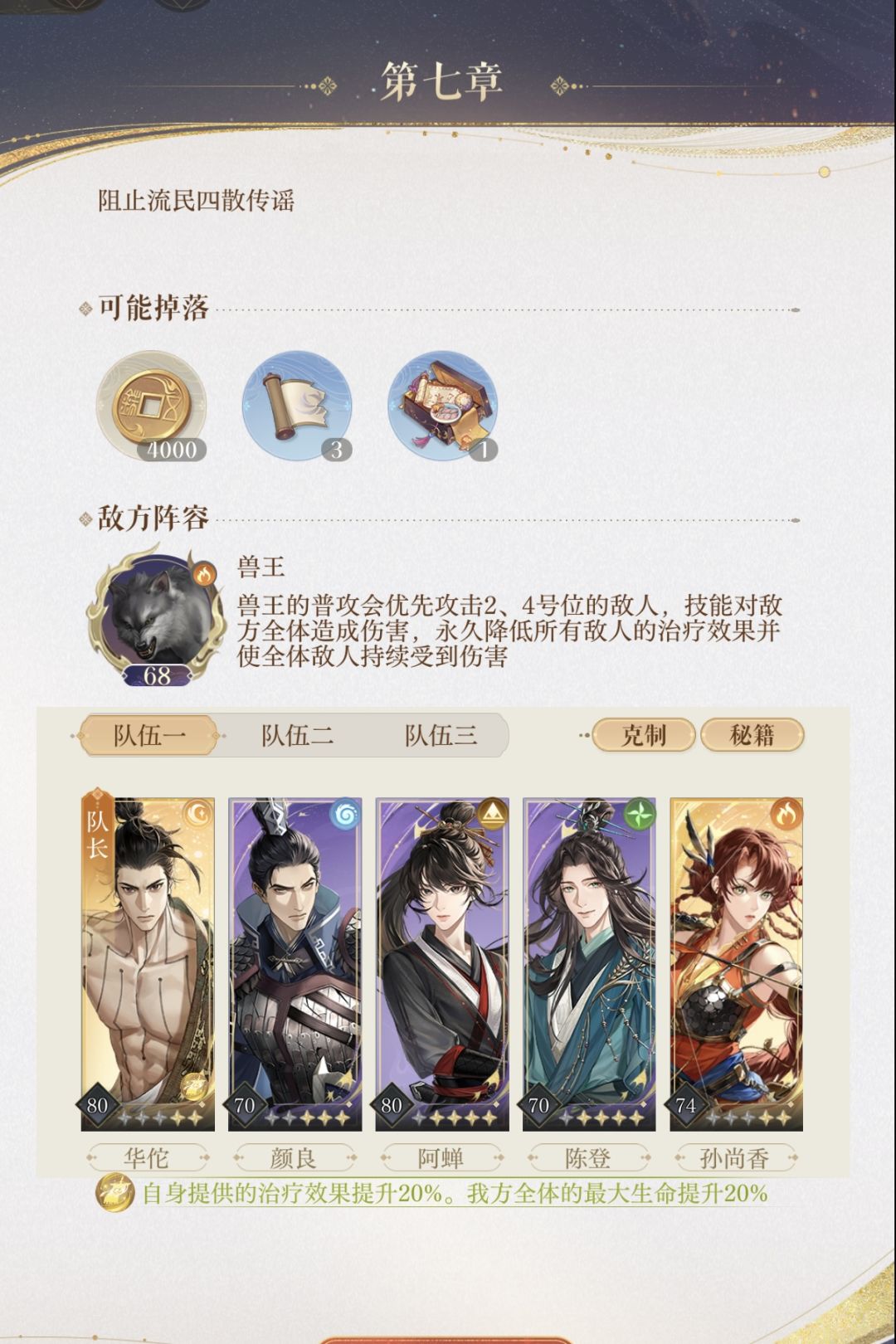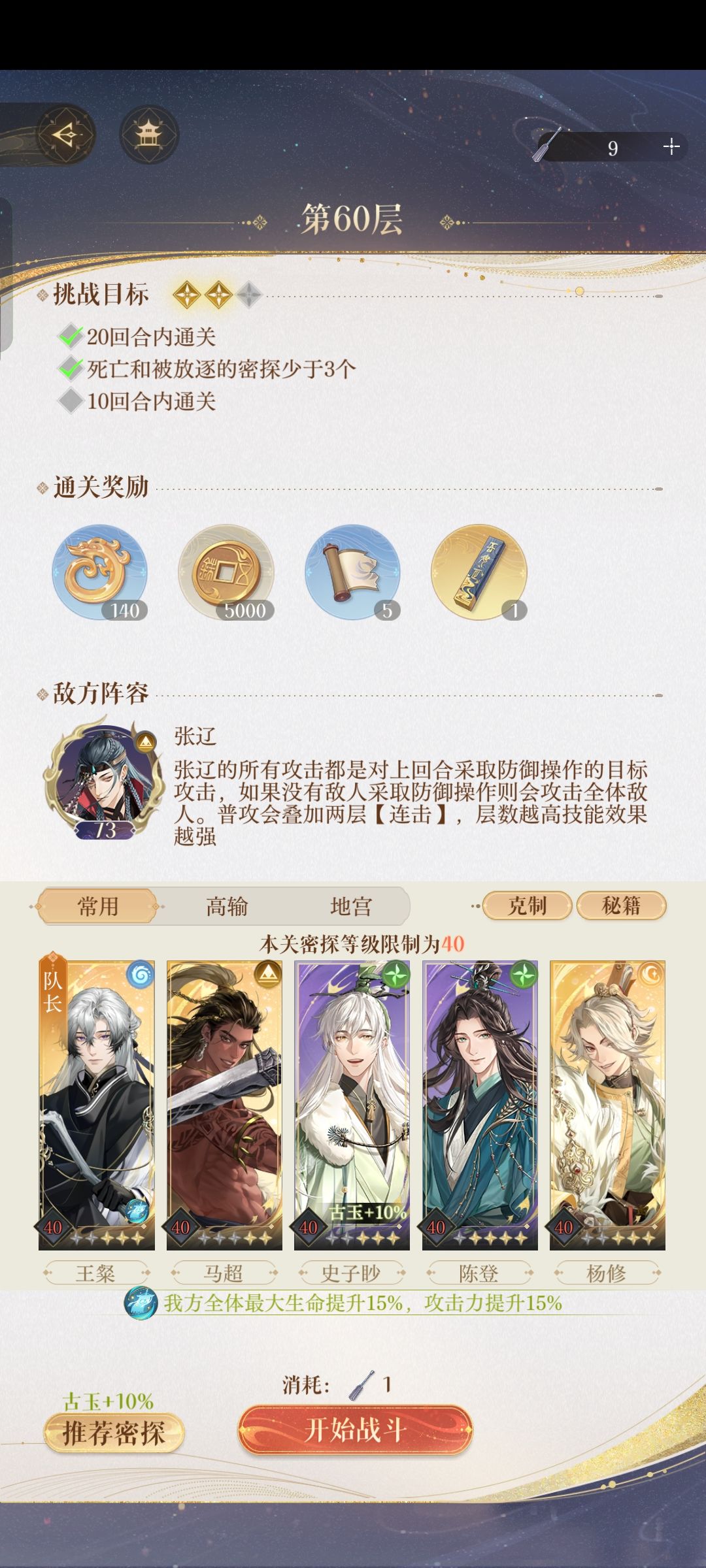◇阵容见图一,练度见图二,史子渺+7,杨修要三星 ◇操作步骤见图三图四。修改部分如下: ★第一回合:陈登 马超就放技能。 ★第四回合:陈登有技能不放 防御,史子渺开技能。 ★★★第十二回合要赌一把,陈登和马超同时防御。 ◆BOSS二分之一概率会攻击马超,如果BOSS攻击马超就重开;如果BOSS攻击陈登,那就稳过了。 ◇3星杨修需要赌2个大双数(我是44 55过的),但15回合杨修技能没放就赢了,感