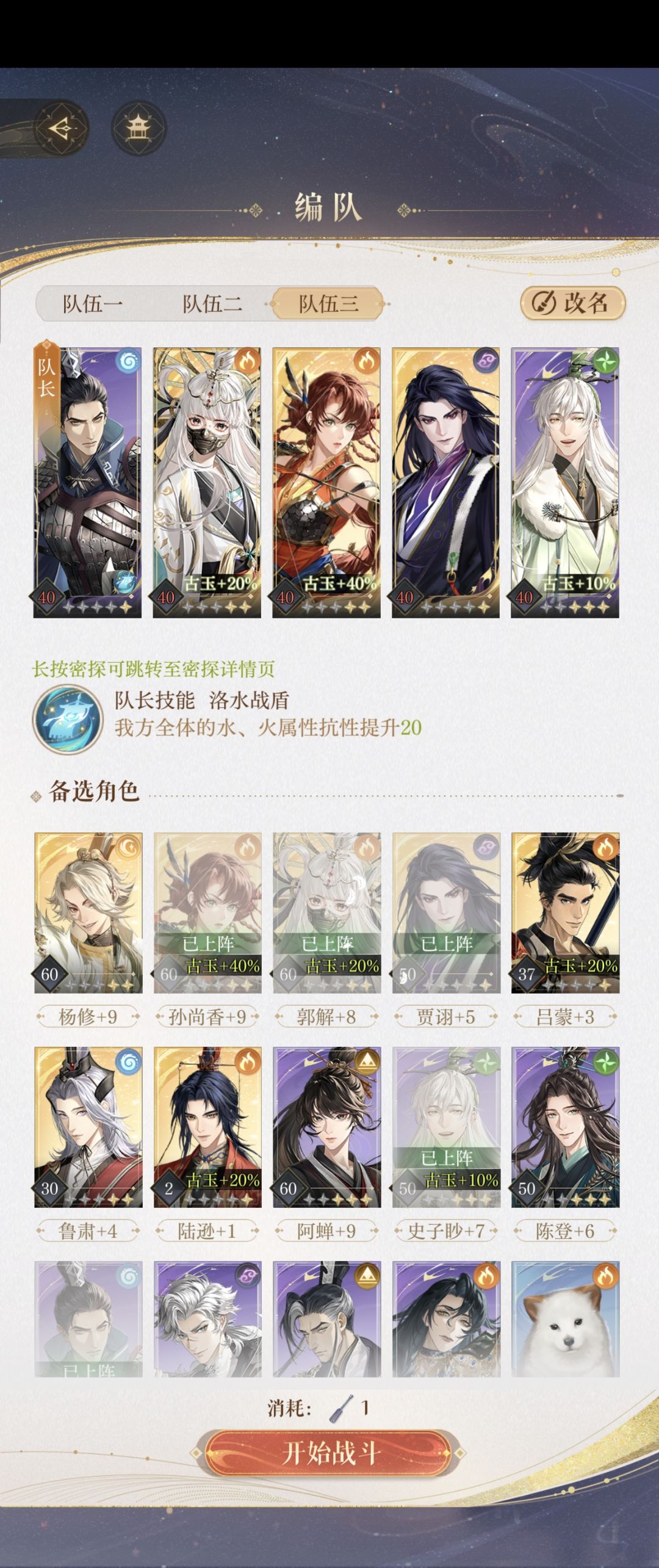 靠捡垃圾和兑换终于把粲拉到了二星,立刻去补地宫[表情_佛了]终于……毕业了 【命盘】 粲(技能给盾+能量-1) 超(以守为攻+出手法) 香(普攻群+暴击提升) 郭嘉(普攻群) 良(生命大幅+普攻回血) 渺(治疗大幅+技能免伤) 修(队长技强化+技能大幅+能量+2) 登(+3) 地宫50层是数值的美 地宫55层是略微看脸 地宫60层是是赌中赌 碎碎念: ①50没什么值得记录的,贾诩这个boss本身就