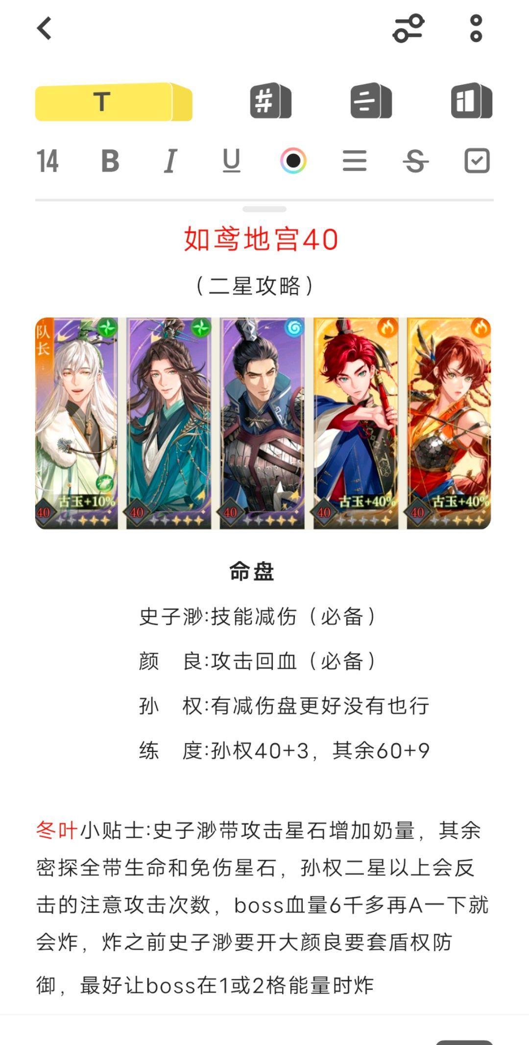 如鸢地宫45攻略【无粲无解】【简单好抄】 🌟配队: 颜良队长 70+11 普攻回血 单体香70+11(可以换任意单体输出,不是风属性就行) 渺 70+11大招减伤 权60+9 防御嘲讽并减伤【必备】 登60+9 初始能量+2 【我的队伍24回合结束战斗,练度不够也没关系,反正地宫压等级影响不大,可以慢慢打,50回合内结束就好】 🌟配队思路 ⭕️颜良上盾+增加火抗 史子渺回血,保证续航能力 孙权