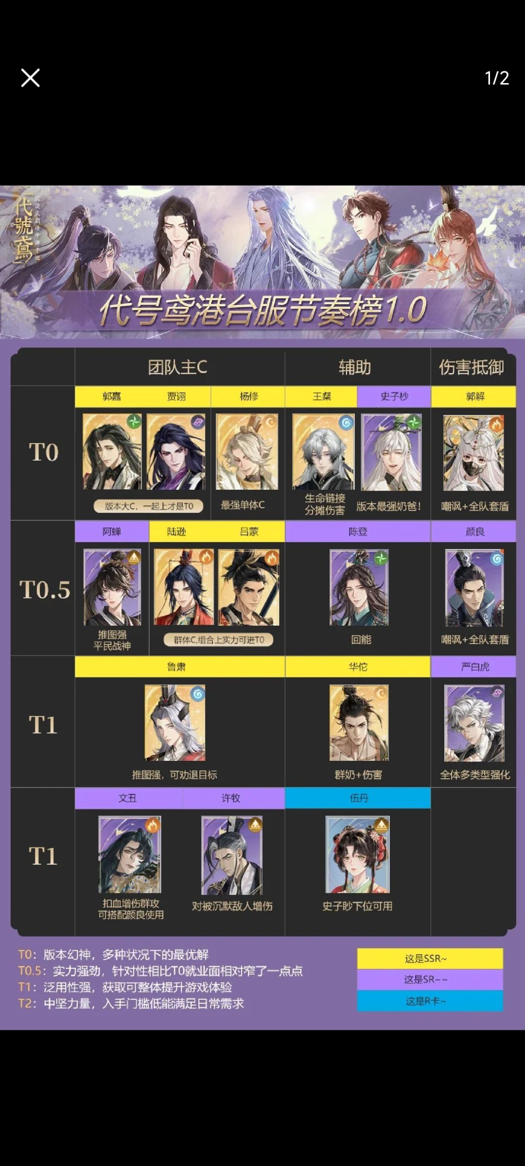 ⭕榜单基于代号鸢制作,最终强度以国服为准 紫卡的颜良、史子眇、陈登都是非常好用的密探,放在现在的外服也依然能就业。 紫卡阿蝉平民战神,叠卡快,伤害稳定,且拥有追击和闪避,前中期都可就业。 ⭕目前已知华佗、郭解、郭嘉、陆逊、吕蒙都有一定程度的加强,是否会改变曾经的“狂赌之鸢”局势还未知。 ⭕总体来说,关卡应该没有之前那样难打了。 ⭕1号开始的江东限定池,都是当时T0的密探,如果担心数值改动,可先等评
