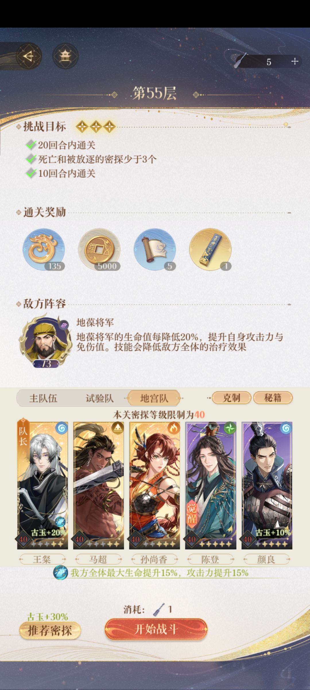 地宫40,无权,无王,华佗版一星过了。太难了。没权没王地狱级难度。 阵型如上,狮子喵队长,奶量越高越好,有减伤命盘更好过,没有也可以,颜良血量过万,命盘有攻击回血会容易过一些,郭解,命盘有攻击回盾,血量过万,华佗弃医从武。 开局普攻,第三轮凳子开大,郭解开大,狮子开大,其余普工。BoS有大郭解开大,颜良开大,其余下拉防御。平稳过渡到第二阶段。 第二阶段难点在于最后一万七的血要在BO S放大前压进5