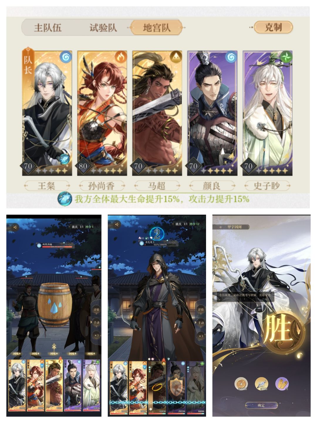 心血来潮想尝试下无粲无解怎么过群怪[表情_裂开] 【命盘】 登(能量+3) 香(普攻群+暴击提升) 肃(普攻大幅+劝退提升) 良(普攻回血+生命大幅) 渺(治疗大幅+技能免伤) 碎碎念: 【图三阵容,图四入场血量】 ①因为实在受够了鲁肃的劝退概率,所以花费了10来个善恶簿洗盘……结果就是洗不到初始格子是概率提升[表情_生气]于是只好花费珍贵的骨算筹给他开了个命盘,为此还给他升级到了45 ②但是这个