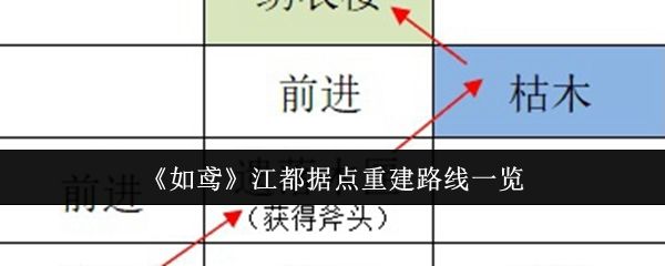 如鸢江都据点重建路线是什么?江都据点需要玩家爵位等级最少在30级及以上,并且通关主线4-12才能解锁。很多新手玩家不知道江都据点重建路线是什么,下面小编给大家整理了如鸢江都据点重建路线一览,一起看看吧。 《如鸢》江都据点重建路线一览 答:具体重建路线可以参考下文 一、解锁条件 1、爵位等级最少30级及以上 2、通关主线4-12 二、重建路线一览 1、渡口:前进-前进-击败强盗-西渡口-前进-击