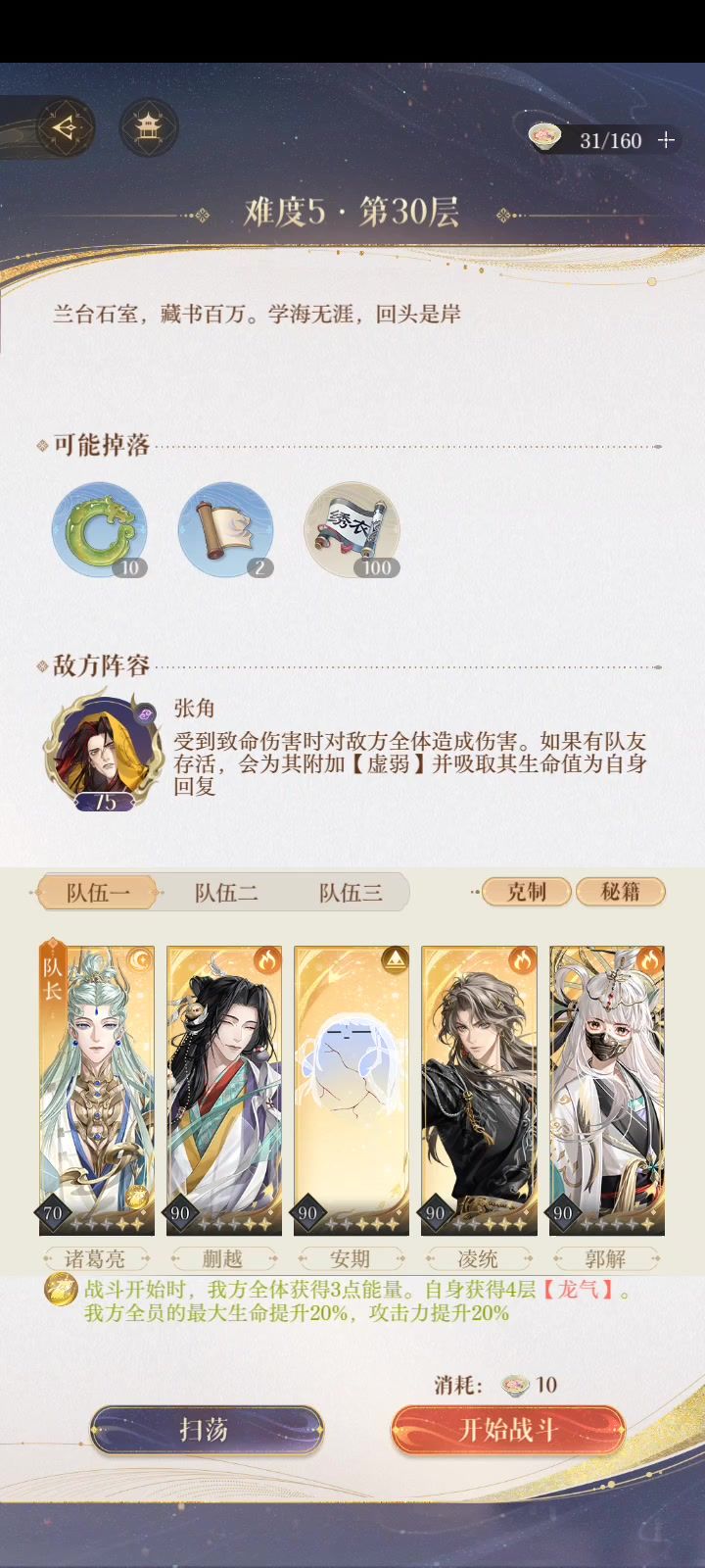 由于极度讨厌靠赌过关,我不太喜欢杨修和孙尚香,总想找不赌的办法过关。加上我打游戏一直以来的信条“一切强度在颜值面前都不值一提”,我坚持xp养卡。所以,在本攻略中,我的张辽和郭嘉的练度都很高,队员换上全家最好的星石。 命盘关键点我都用文字说明,最后附上我家张辽和郭嘉的漆园蝶面板。套盾:我家二星张辽和三星郭嘉,低星不保证成功率。(呜呜呜,失败了别回来喷我,我不是你们的心头肉了吗?) 好的,先贴上配队: