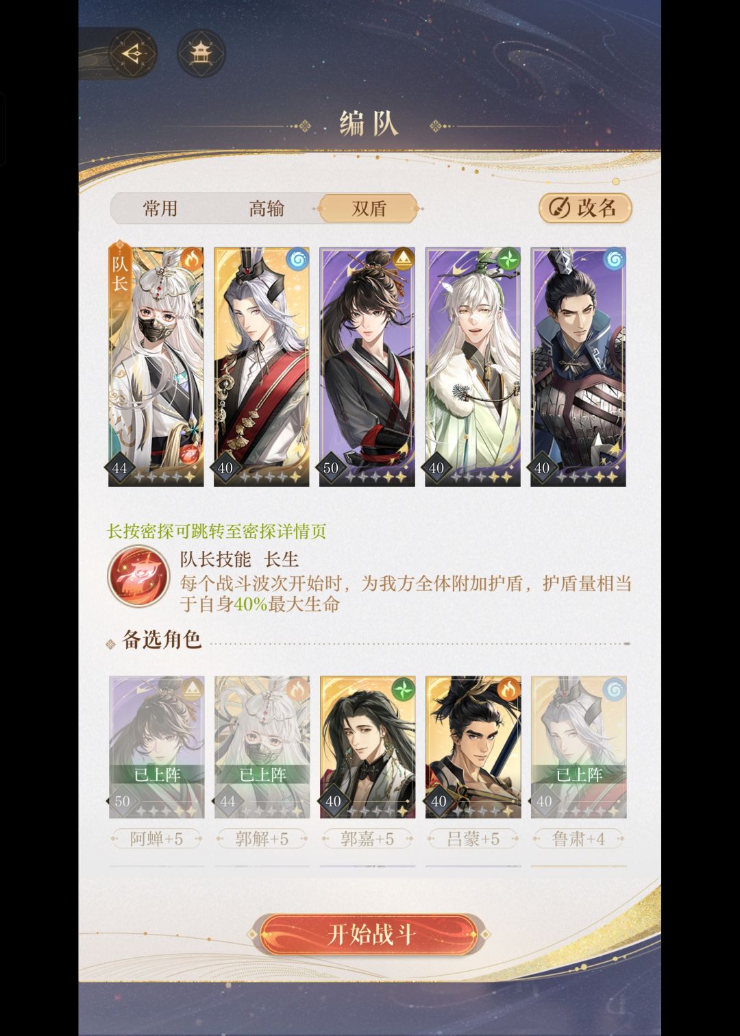 阵容如图一,只有阿婵50级,其他全都40级(都是+4 +5的密探),参考图二打法,略有不同哈~ 图一:狮子喵+4,颜良+5 tip:主要赌鲁肃前两次技能劝退两个大刀男(红衣),多刷几次很快的~ 队员攻击都对着枪男(蓝衣)!不管是普攻还是技能!!大刀男靠鲁肃劝退!!! 郭姐跑路就重开(图三) 第一回合 郭姐队长技能有盾,狮子喵下拉防御,其他队员全部攻击血量较低的枪男 第二回合 阿婵 郭姐 颜良攻