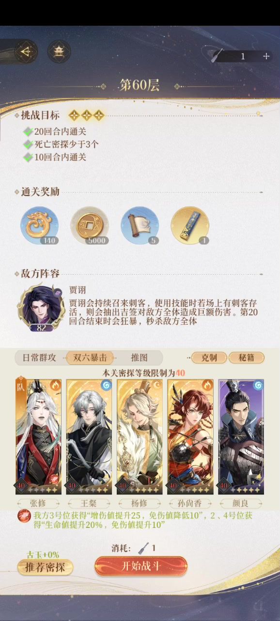 给还没过的分享一下 王粲【技能消耗-1】+华佗【悬壶济世,这个这相当于奶了】+文丑【初始能量+1】+颜良【这个没啥特别的】+鲁肃【没啥特别的,普攻大幅增加应该后期就不用开大了】 全都是50+7王粲是二星偶尔得的,终于过了,我觉得其实一星应该可以,就是尽力伤害能最大就最大,我是第三回合才干掉小怪的,应该没事有华佗普通加奶