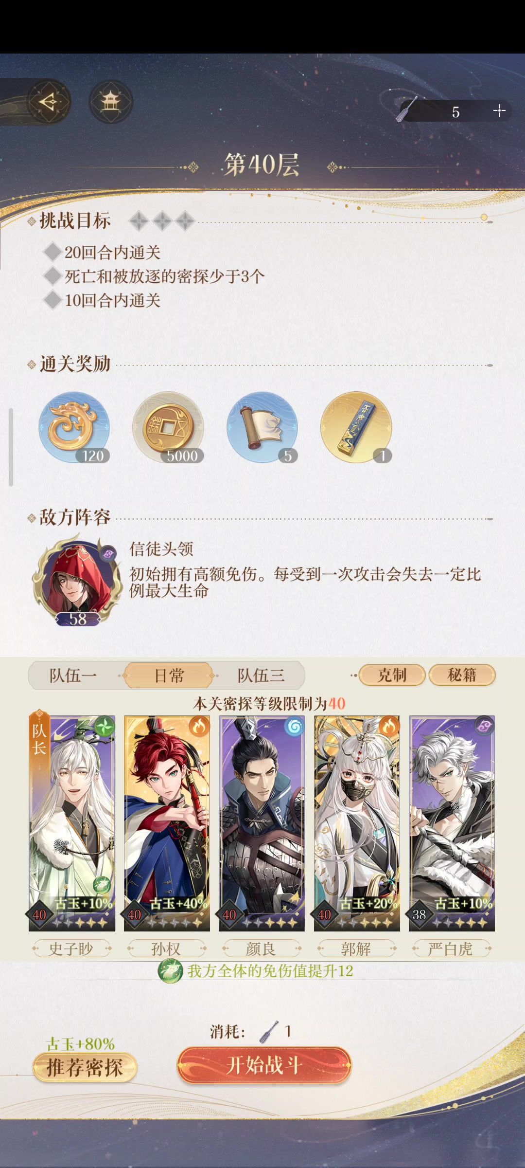 慢悠悠地打完了,比上期地宫好打多了。 摸清机制,练度足够,不用赌(上期地宫就是机制要赌),一小时可以通地下遗迹(上期一关都不止一小时) p1:地宫60三星配队,很明显是用爆发型配队会过的很容易的关卡 p23456:地下遗迹 看得出来,荀彧已经进入各大配队中了,人权卡没得说。