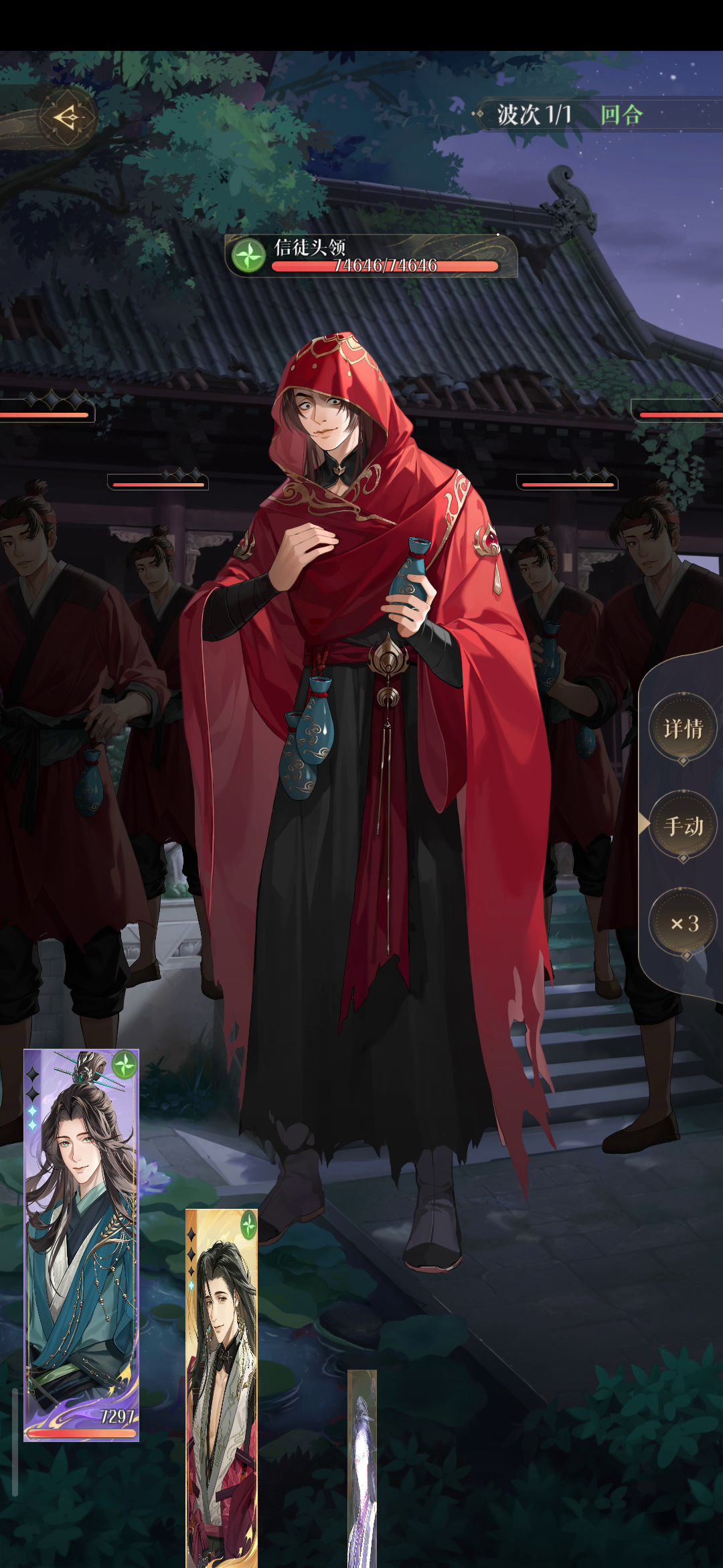 队长:狮子喵50+7(命盘洗开大加防御) 香香47+6(命盘洗普攻群伤) 颜良50+6 文丑45+3 华佗50+7(其实一星也成,换别的群奶也成,保证BOSS开大后能及时将全队血量回到3000+) 保证BOSS第一次开大后全员存活就基本成了,赌香香暴击,有退场就直接重开。 血量低于三千时下滑防御,BOSS开大时除了颜良和狮子喵放技能其他人全防御,扛过大招后华佗立刻开大将全队血量拉上三千(个别拉不上