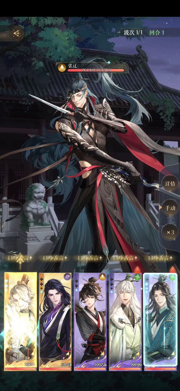 因为练度足够,基本上没赌。 一星王粲70+11:能量消耗减一,同生共死加一(本关非必要),技能提供护盾(非必要) 一星杨修70+11:技能大幅,初始加二(杨修攻击3500) 一星单体香70+10:普攻变群攻,技能中幅 四星阿蝉70+11:技能大幅,普攻大幅 二星颜良60+9:普攻回复生命(血厚非必要) 开局杨修砸个双数给阴属性小弟,第三回合(小弟开大前)可以干掉他。(阿蝉的大记得打在王粲身上,属性