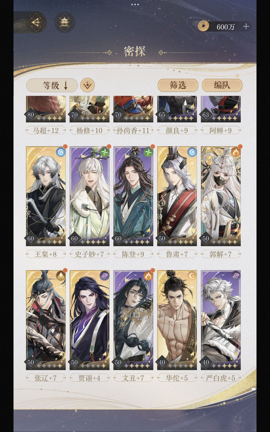 主线第九章要上线了,新人楼主急推主线的话就很需要注意经验卷轴的合理分配,在0氪时经验卷轴是非常紧缺的,提前规划好养哪些密探,再分配每日的体力打对应的材料本,能大大缓解卡关问题。 队伍配置:2盾2输出1辅助 盾卡: 郭解、颜良、严白虎 3选2,同等级下郭解的队长技更实惠些,前面两位抽到就一定养起来,在主线中有很多对单或对群的高伤害技能需要盾和奶硬抗,严白虎更好获得,抗伤基本够用,新手必练。 输出卡: