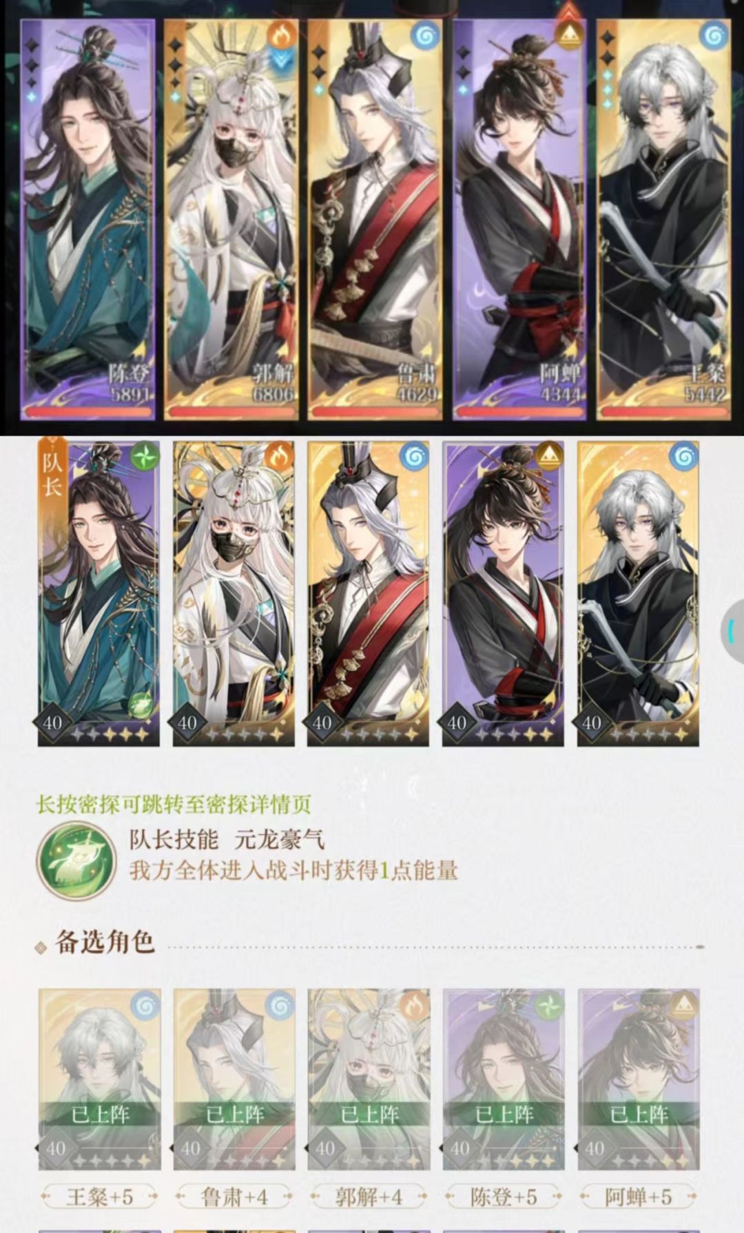 需要密探:颜良 鲁肃 阿蝉 王粲 陈登 除颜良外可换相同定位密探 需要等级:全员40,至少+3,颜良至少二星,无星石要求 出招顺序:(用鲁肃的话鲁肃全程不用放大)(有狮子喵替王粲的话②可回血伤员不用重开) ①王粲下拉开盾,其余普攻。赌打到颜良或王粲,不是直接重开 ②全员普攻 ③颜良上拉开大,其余普攻 ④⑤除颜良只普攻外,其余哪里亮了点哪里,有大就放没大就普攻 ⑥颜良上拉开大,其余下拉开盾。陈登练度