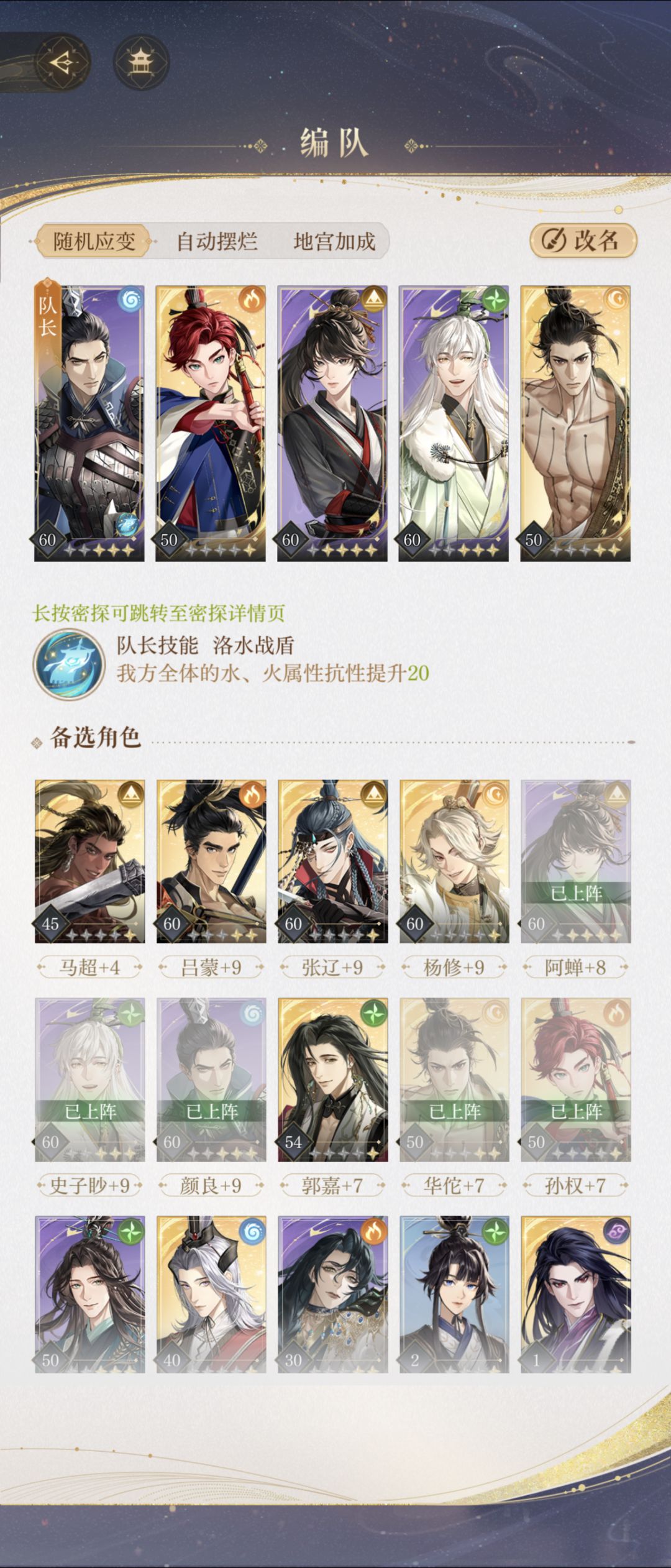 分享下自己的常用阵容 图一是常用队 图二是打类似5-7的劝退 图三常用针对地宫三星条件更换 补充:p5p6 过兰台30层很好用 p7小号尝试下郭嘉贾诩过主线 p8小号单抽出王桀 圆满了 补充:到今天我才发现 地宫不用防御过关是指不下拉防御……我以为是下盾一直把盾下了硬磨过去的_(:3」∠❀)_ p9忙起来弃了几天才回来更新一下最新练度 燃犀照夜只把最开始的两boss打了