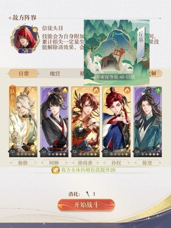 奖励: 通关五层历险获得12限定符传 每周自动历险10次拿下14普符 两个洞窟48善恶簿➕20功过格➕星石瓶子 历险密探优先升级: 阿蝉、伍丹(细沙粘土)、李脱(虹石)、严颜(铁砂碎铁)、蛾使(鸢绒羽线)、崔烈(麻草熟麻)。 但所有密探都尽量升级满级。 缺哪个材料自动历险就派遣对应密探。不特别缺某一种材料可以派遣满级马超,有双倍奖励。 速通阵容: 徐庶周瑜令狐茂陈登阿蝉 没有特别难的机制关