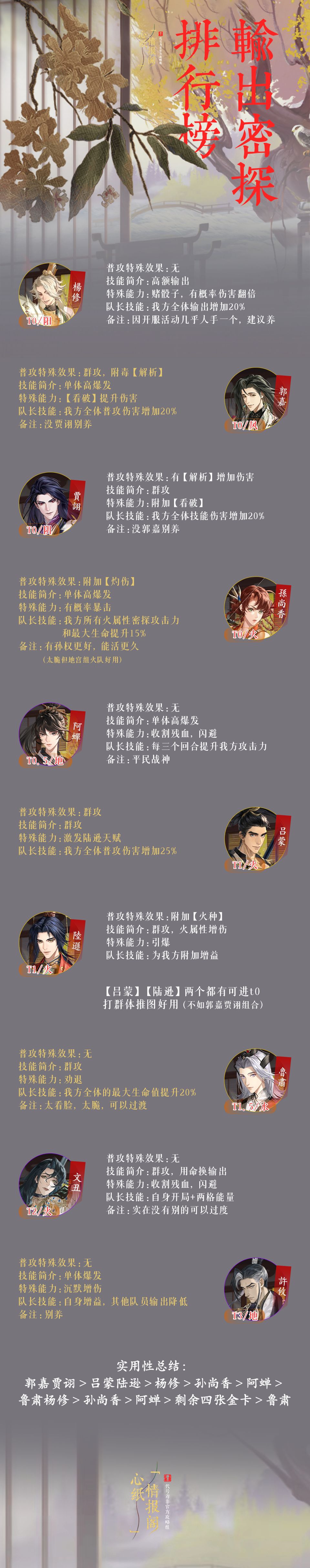前言: 仅作为密探0星时培养收益高低进行排名,普通玩家资源有限,请合理安排资源,保证收益最大化; 命盘由于善恶簿和功过格比较难获得,请合理分配; 命星推荐只作为0星时参考,实际情况请根据自己阵容进行调整。 每个人对游戏见解不同 如有不同的/更好的培养意见欢迎各位楼主评论区讨论 转自:心纸情报阁#攻略#游戏安利#游戏推荐#游戏讨论#游戏资讯