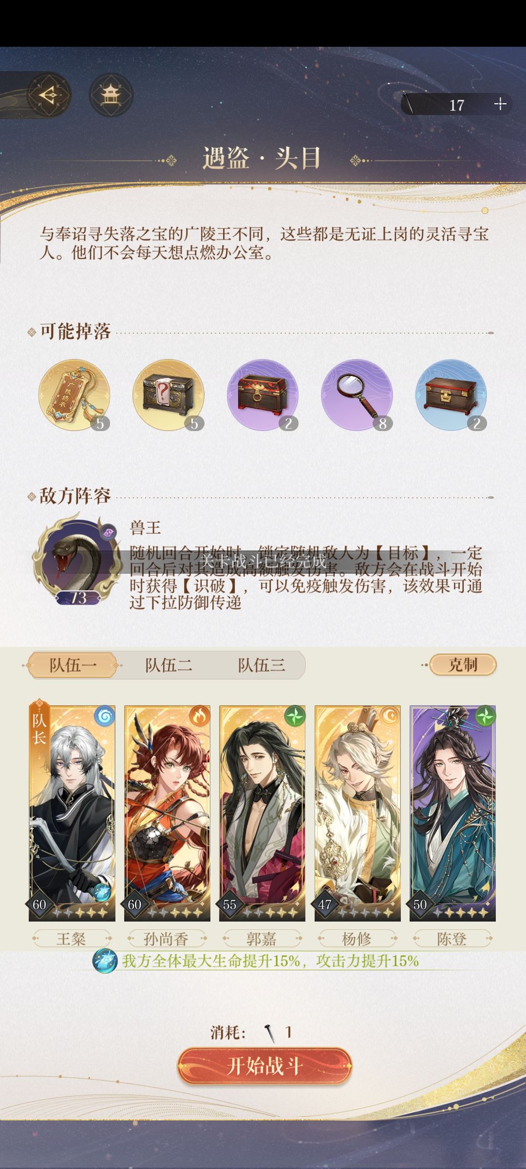 坑坑的活动! 刚开始上华佗婵渺颜修,打得还很美觉得稳稳的,结果十五回合一过战败(可恶啊没注意必须十五回合内取胜)[表情_生气] 接下来我头铁,没去找攻略,而是自己调整队伍,想着上个队伍虽稳但输出不够,于是我把颜良下了换香(这队伍是可以的奈何我依旧让华佗当队长),因此我开启了不断重开之路(总差一截血就会让我忍不住赌修香的双数和暴击) 实在赌不出我觉得输出还是不行,华佗换了陈登,想加速大招循环,但仍然