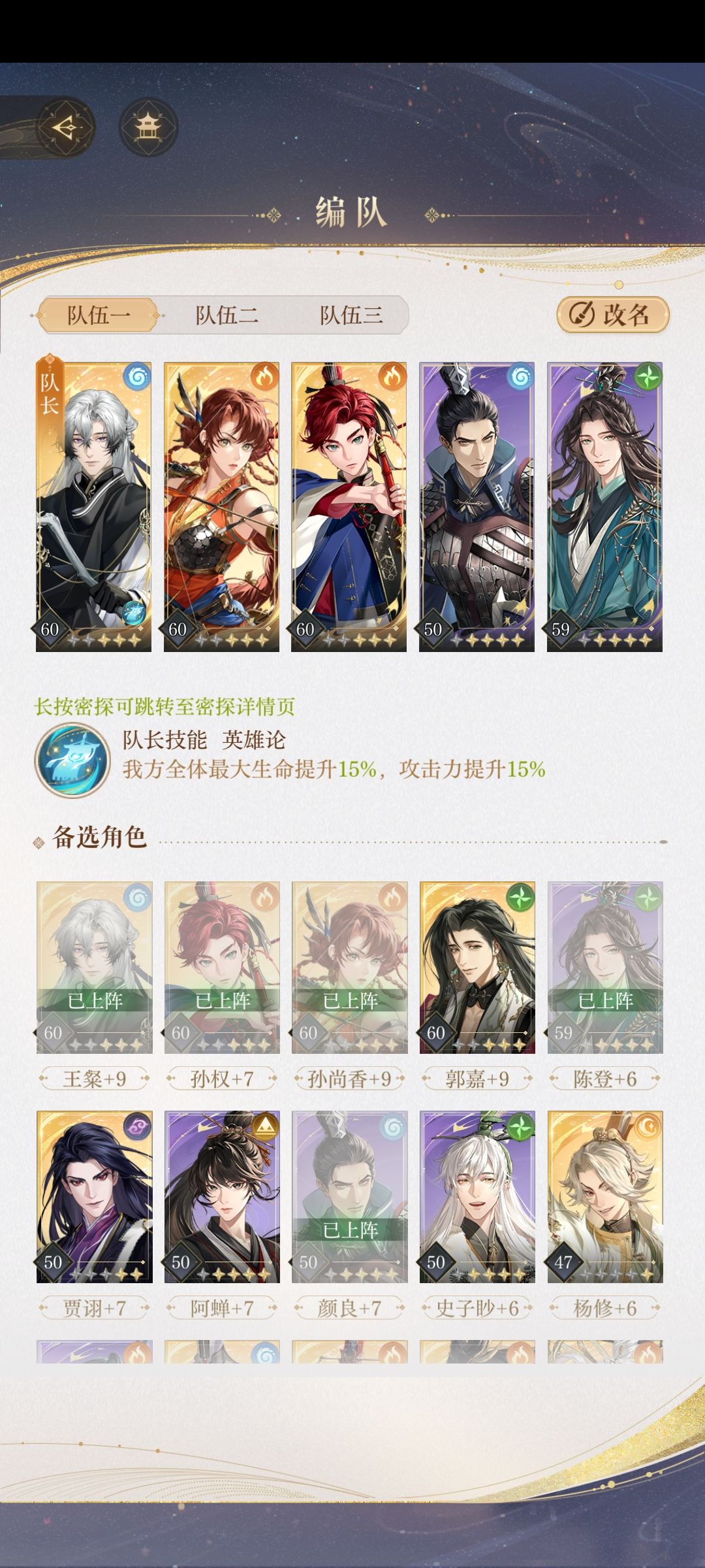 (还是老样子,有问题评论区。)匣子首领:1号位杨修二星60/8,2号位孙尚香二星50/6,三号位陈登三星50/7,4号位阿婵三星50/7,五号位王粲一星50/7。 孙尚香和阿婵最好能洗出来强化技能伤害的命盘,我陈登是初始能量+2,王粲是技能消耗能量-1,如果王粲第三回合才出大可能循环不起来,杨修有初始能量最好,没有就堆技能伤害。 tips:孙尚香不能演,不然打不完。没有二星就需要凹更多暴击和杨修骰