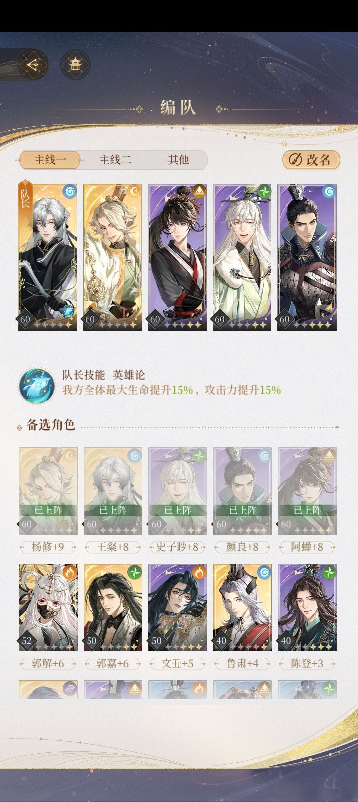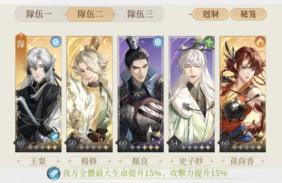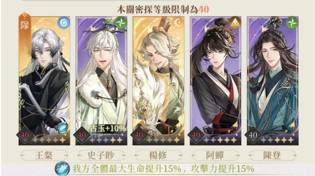 不知道有没有人发过了,之前卡关刷论坛发现要的练度有点高,我自己摸索了一下。 杨修:58+8 颜良、史子眇、王粲:50+7 陈登(要刷命盘:初始能量+2):50+6 思路就是杨修攒大在boss放大前放 boss放完大接颜良的大,后一回合史子眇放大奶全队,血量危险的话也是防御,陈登放大,给王粲放大。boss能量条攒满了不要打它,全部防御。 (因为只能发九张图,颜良的命盘不太重要就不发了。) 第一次发攻