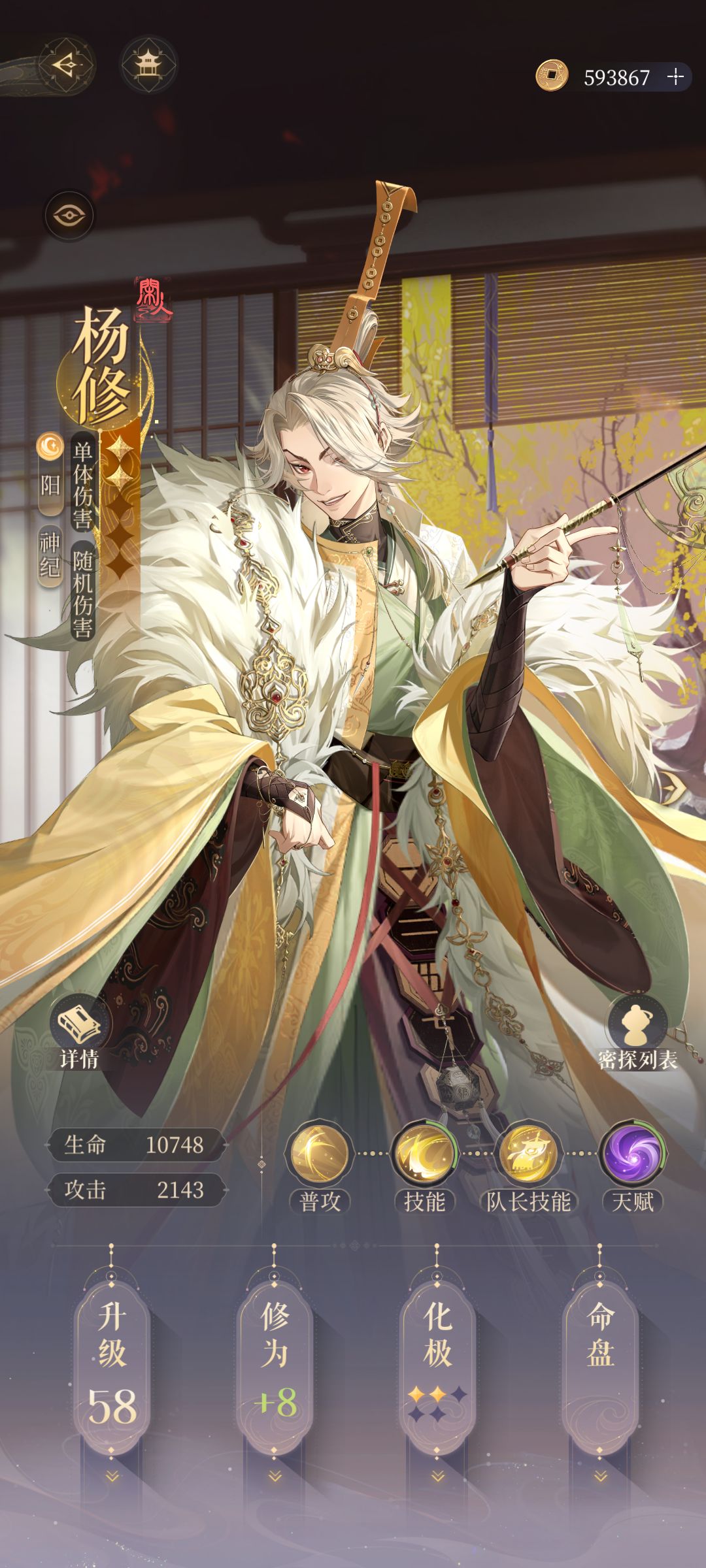 主线第九章要上线了,新人楼主急推主线的话就很需要注意经验卷轴的合理分配,在0氪时经验卷轴是非常紧缺的,提前规划好养哪些密探,再分配每日的体力打对应的材料本,能大大缓解卡关问题。 队伍配置:2盾2输出1辅助 盾卡: 郭解、颜良、严白虎 3选2,同等级下郭解的队长技更实惠些,前面两位抽到就一定养起来,在主线中有很多对单或对群的高伤害技能需要盾和奶硬抗,严白虎更好获得,抗伤基本够用,新手必练。 输出卡: