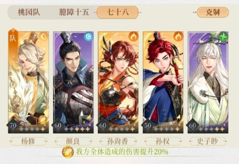 配置:60+9颜良、史子眇、一星孙权(可替换),70+11二星杨修、孙尚香 命盘:颜良史子眇杨修普通推荐命盘,孙尚香暴击效果加成、普攻群伤、技伤中幅增加。 星石:杨修、孙尚香双孔30级生命、攻击宝石,其余垃圾 打法: 1.颜良杨修孙尚香不防御,直接进入臆障状态。 2.留颜良技能顶张修大招。 3.干吉在场时保证有且只有史子眇或者一名盾角色防御。 4.史子眇第一轮、第二轮可以防御。如果队伍能在干吉有大