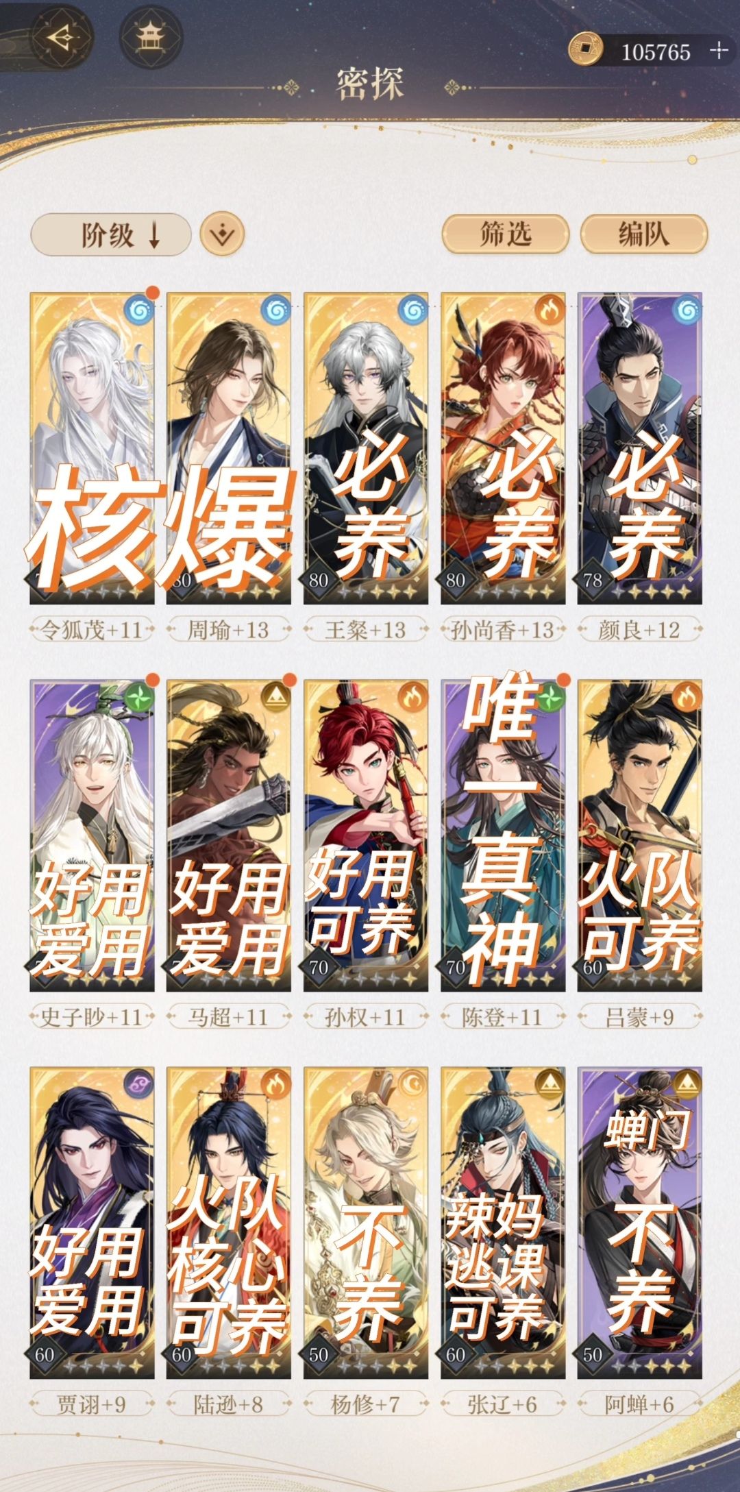 #如鸢攻略征集 #如鸢攻略征集 输出:孙尚香马超作为一队主力可以优先拉,养好一队的基础上再拉周瑜 盾:颜良郭解t0必养(中千氪无解谁管管 lxhy 孙权偏对策,资源紧缺可以稍稍再拉 辅助:王粲陈登纯人权无须多言,狮子喵拉到70就行先观望一下新池 拐:贾诩洗好命盘非常好用建议养,令狐茂目前绑定周瑜看情况拉 关于副 c ,优先马超,没有 gin 哥就杨修,阿蝉,养就养了反正副输出就是补伤害的80级差