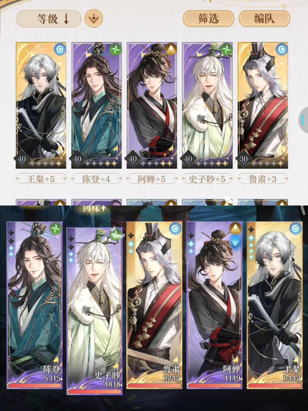 放在前面∶ 为什么不是5-30,因为全50+6练度,难度极大,而且华佗没养,输出不够,走了弯路。 准确来说还是有点沉浸在港服经验之中了,而且国服我账号也不可能全部角色都养起来看效果,今天才意识到,所以赶忙来给你们出个攻略补救一下。 时间紧急,简单来说。 回顾一下我之前给大家的配队建议∶ 一队∶王粲陈登阿婵颜良(郭姐)史子眇。 二队∶华佗郭姐阿婵颜良史子眇。 这两天做了一些极限测试(被迫),在国庆活