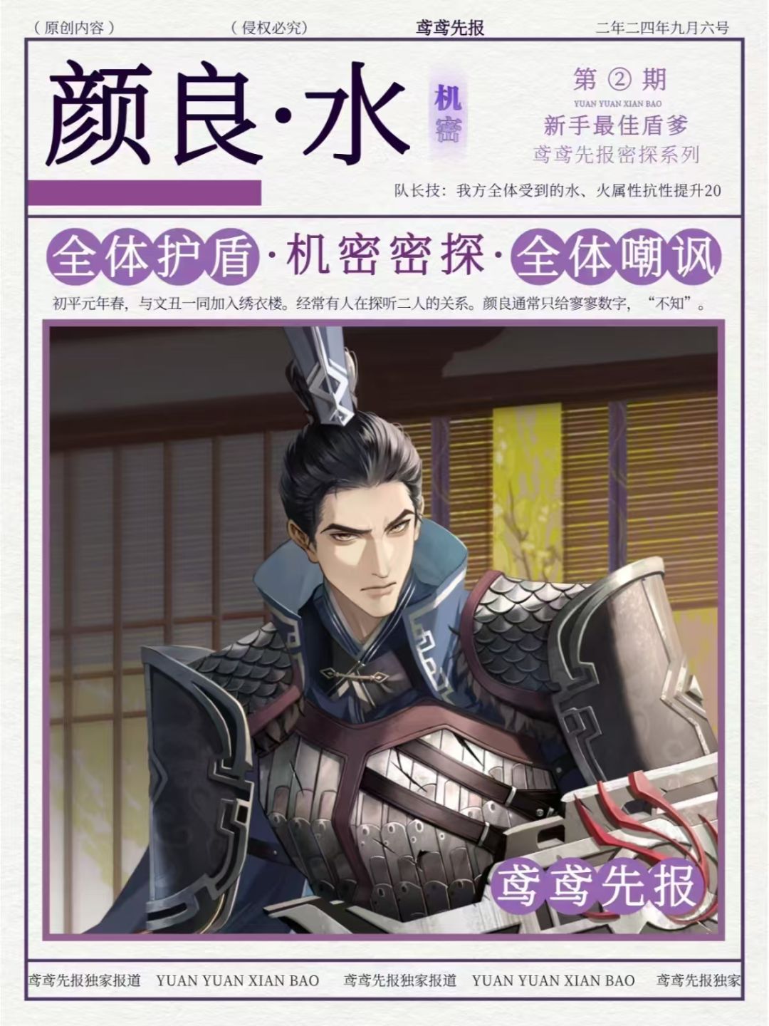 颜良史子眇陈登阿蝉 可以说是新手队伍性价比最高的 其中颜良就是新手推荐盾爹第一人 全体护盾+全体嘲讽 能帮助大家减少存活的压力 *使用国际服的数据,如国服有改动,后续更新