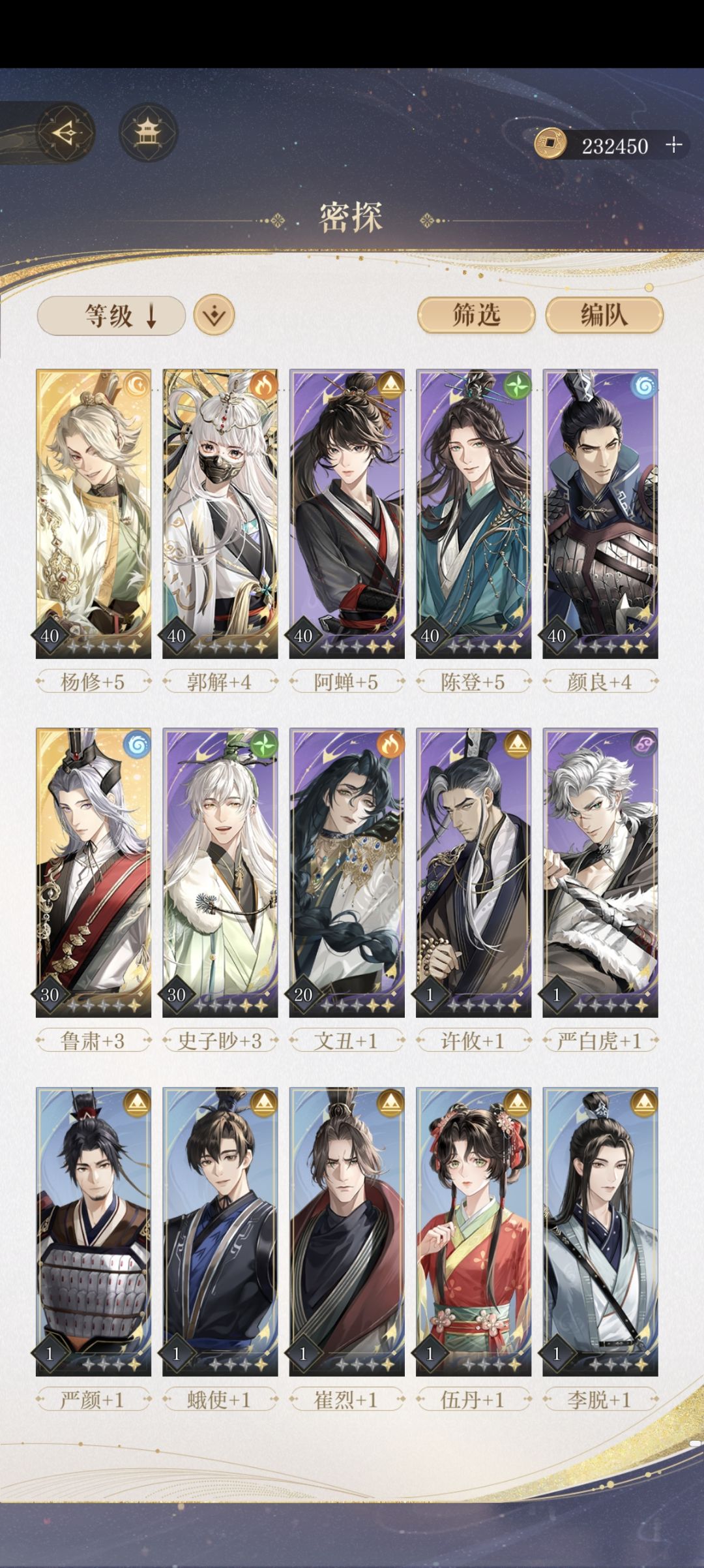 之前练度太低打不过桃源普通30,升级杨修和颜良60级后就打过了,其他密探均50+7,阵容和手法如图。