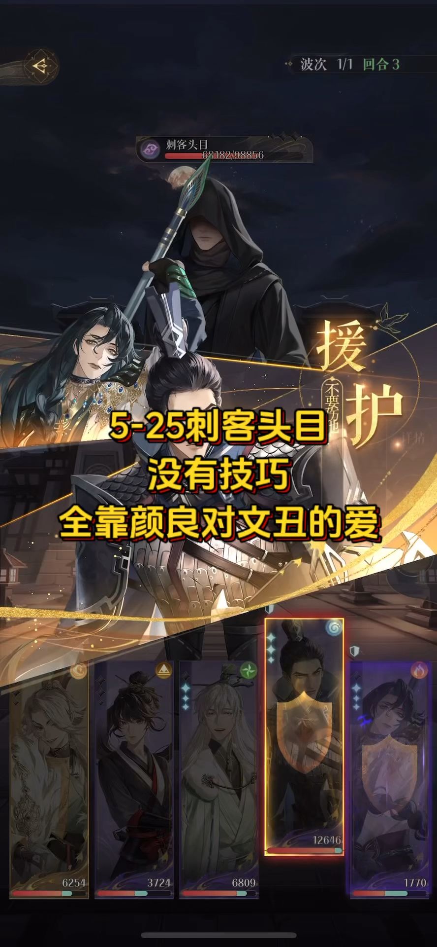 大概BOSS还剩一万多血量的时候其他人都没了,颜良硬生生靠平a打赢了 顺便分享一下6-25我的队伍配置 队伍,颜良(60+8/命盘普攻回血),杨修(60+9/命盘开局能量2),鲁肃(50+7/劝退几率提高,能量加一),阿蝉(50+7),史子眇(60+8) 开局杨修扔大打小兵,如果没有开到双数把人打死就重开,然后史子眇下拉,其他人正常打,后面鲁肃要劝退一个,BOSS能量满时,颜良开大,其他人下拉,这