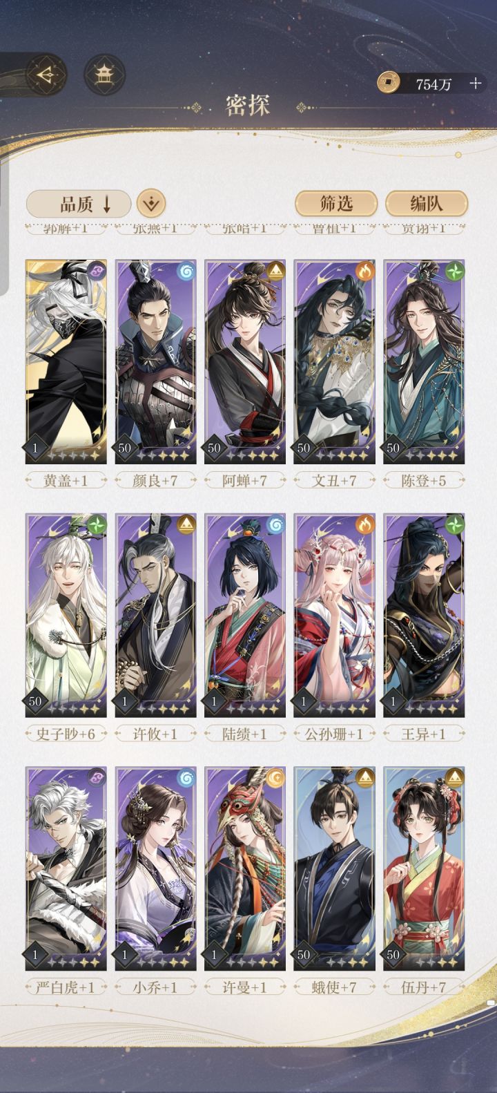 前期是最缺资源的,没规划很难玩。你的主c都缺队友,诸葛瑾缺弟弟。张昭缺张飞 张邈。火队勉强能玩献祭流。考虑一下把郭嘉 杨修 孙尚香重置掉。全部资源只养一个凌统,多的先囤着等后续出其他密探在培养一个能打关卡的配对出来