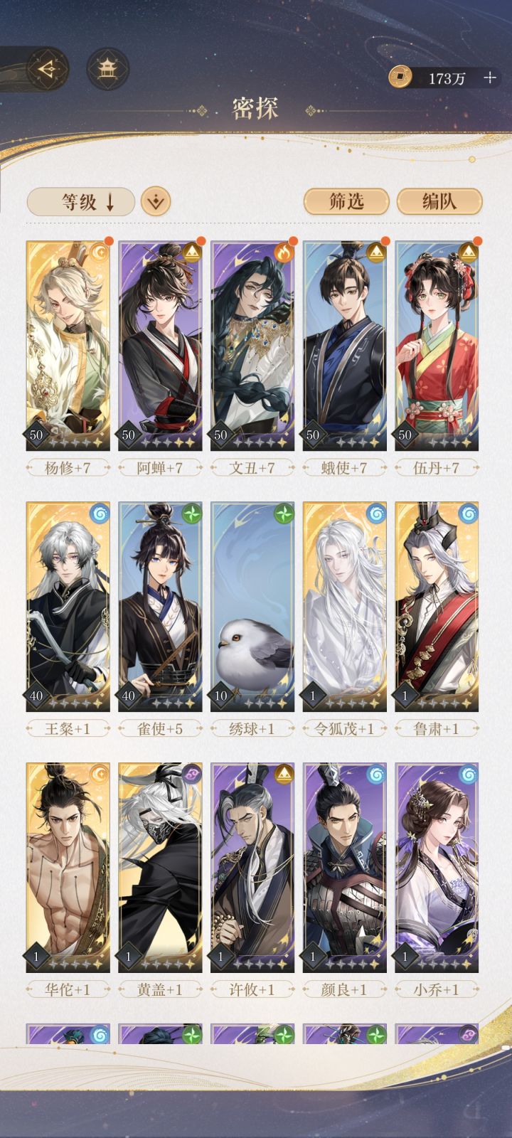 前期是最缺资源的,没规划很难玩。你的主c都缺队友,诸葛瑾缺弟弟。张昭缺张飞 张邈。火队勉强能玩献祭流。考虑一下把郭嘉 杨修 孙尚香重置掉。全部资源只养一个凌统,多的先囤着等后续出其他密探在培养一个能打关卡的配对出来