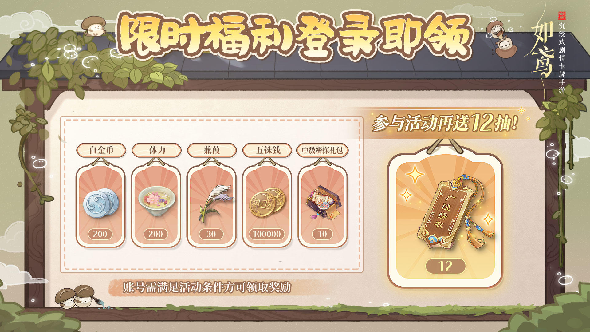 故事和情感交汇,创作喷薄而出,最终凝结成「三千宇宙」的特别展览。现在,是交流和欣赏的时候了!另外,或许是由于奇妙的地脉波动,或是由于过于思念殿下,最近圆圆的鸢子身上长出了奇妙的菌子,殿下若是有空,还请来美术馆看看。🎁佳节佳时,常欢常喜临近年关岁末,感谢殿下一年以来的辛劳。工部特别申请到一批补给,为来年发展打下基础,壮绣衣楼的声势。礼包内容:200白金币+200体力+30蒹葭+10中级密探礼