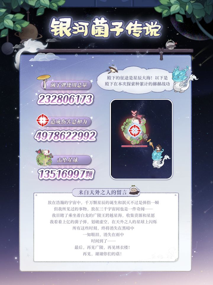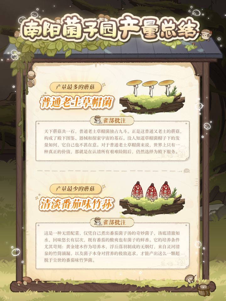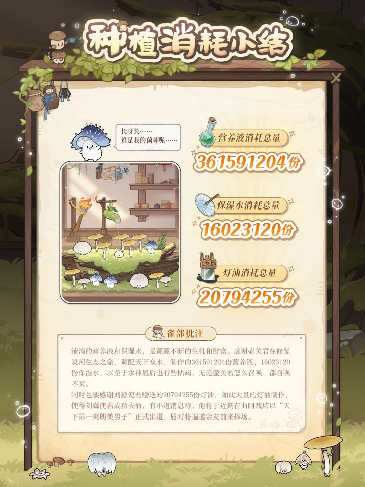 菌菇种植是一项涉及多领域、多系统的复杂工程,对整个绣衣楼都是前所未有的考验。在亲耕过程中,楼主凭借耐心和毅力,攻艰克难,最终得到了非常显著的成果!雀部已经完成对躬耕南阳活动的相关统计,请楼主过目。如此惊人的产量和数据,给绣衣楼带来了巨大变化:食堂菜品丰富度显著提高,综合生产能力迈上新台阶,并且在菌子种植、航空航天等关键项目得到显著进展。相信新一年,绣衣楼在农业、交通等领域将会迎来长足进展。#如