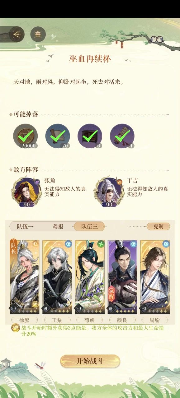 配置参考: 🌟觉醒颜良 90+15 生命大幅/攻击回复 31天相30紫薇1巨门(后面挂了大概就是因为星石没调好,我忏悔) 🌟三星王粲 90+15 技能护盾/技能消耗-1/治疗提升 40七杀31天府40太阴 🌟觉醒陈登 70+11 能量+2/能量+1 30巨门1太阳1天相(活着就好,颜爹的巨门原来在你这儿…) 🌟二星荀彧 90+15 王佐/回合恢复生命 40太阳30天相30巨门 🌟二星徐庶 90+1