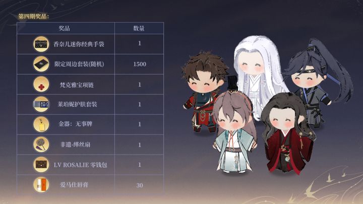 官网抽奖活动第3期奖池已经更新,本期奖池内含梵克雅宝项链、非遗-缂丝扇、男主周边套装、爱马仕唇膏等好物。感谢各位殿下的持续支持,将为所有预约的殿下送上额外3次抽奖次数,助力殿下冲刺大奖。请殿下在8月30日14:00后登录网页,刷新后获得抽奖机会。🎁第3期奖池情报及活动最新参与规则· 官网预约抽奖活动共有四期,每期奖池有所不同,各期的抽奖奖品均可在官网奖池预览,总价值超过40万;·