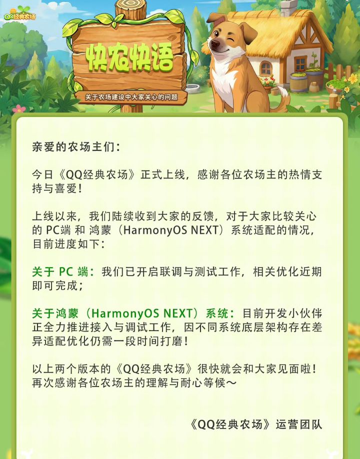【快讯】QQ经典农场公布PC端及鸿蒙适配进度