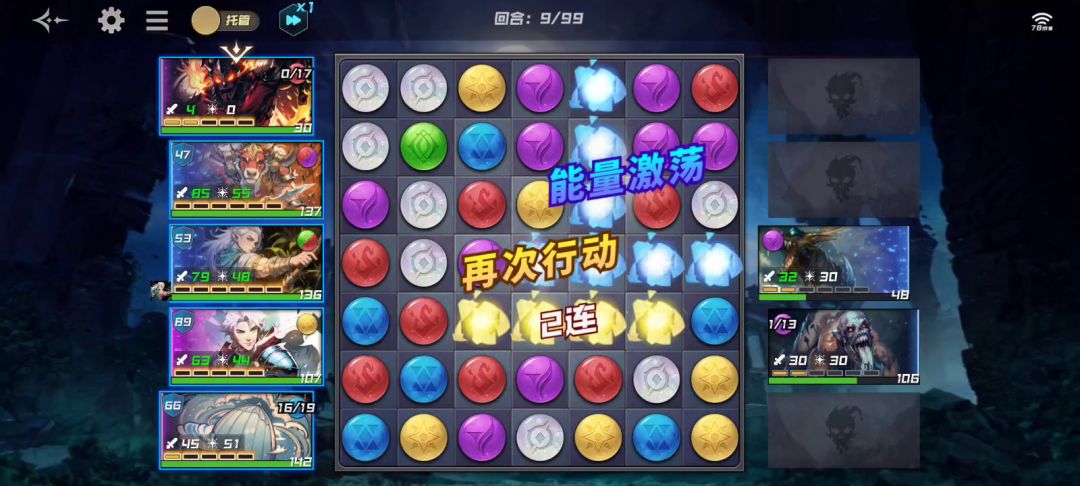 玩家:威,ID:15879。 上一篇我们讲了手动消除技巧,这一篇来说下如何用技能造多消,持续再动。 1、指定转化 主动技能都是选择1种心能,将所有该心能进行转化,利用好就可以人为地造4+消从而实现持续再动。 以黑市商人为例,如上图,紫色连着绿色,只要利用黑市商人的主动技能将绿色转化为紫色就能达成6消,实现再动。 如图,不要急着去消紫珠,更好的方法是直接将蓝色转化为紫色,这样一个5消,一个10消,触